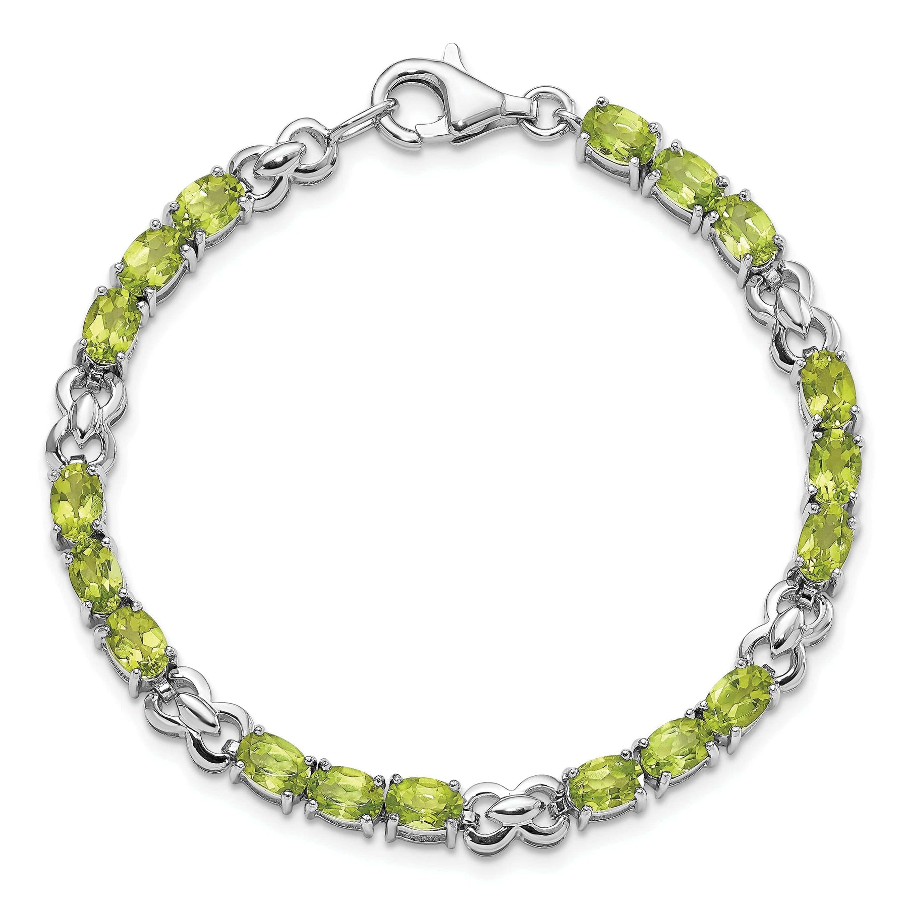 Elevate your wrist with the stunning beauty of this Silver Oval Shape Peridot Gemstone Bracelet. Crafted from high quality sterling silver, this bracelet features a polished rhodium plated finish that adds a touch of elegance to the piece.