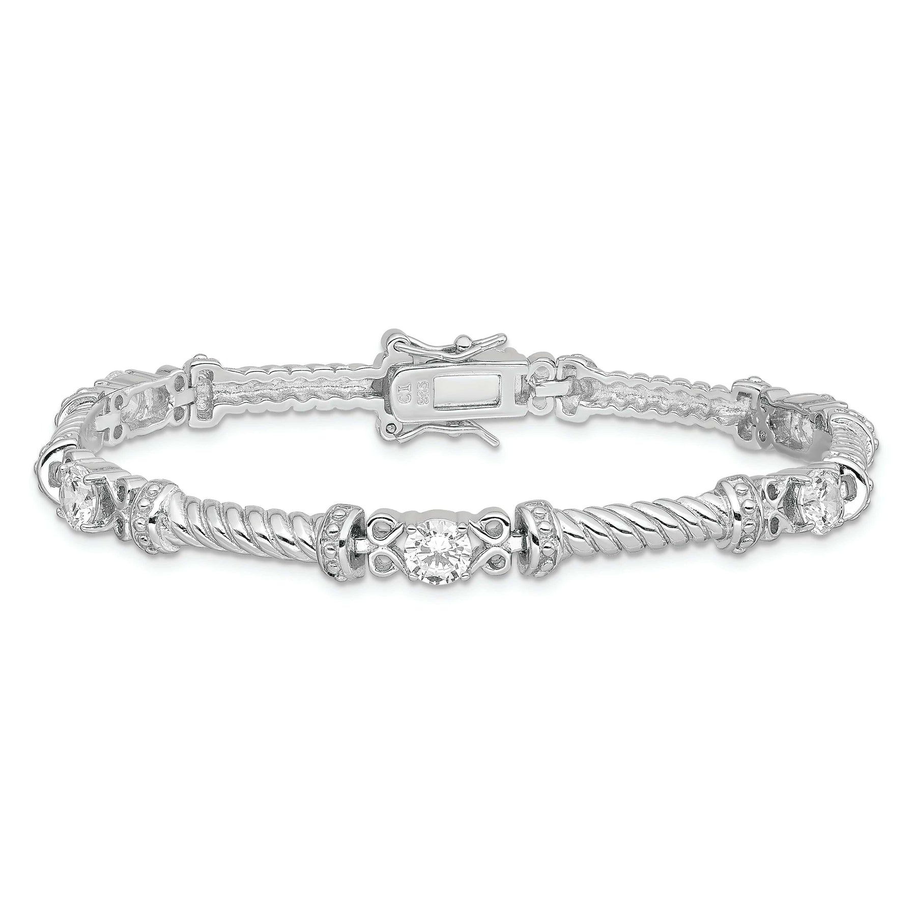 Elevate your style with this stunning Sterling Silver Polished Finish Cubic Zirconia Bracelet. Crafted from high-quality sterling silver and rhodium plated for added durability and shine, this bracelet exudes elegance and sophistication.