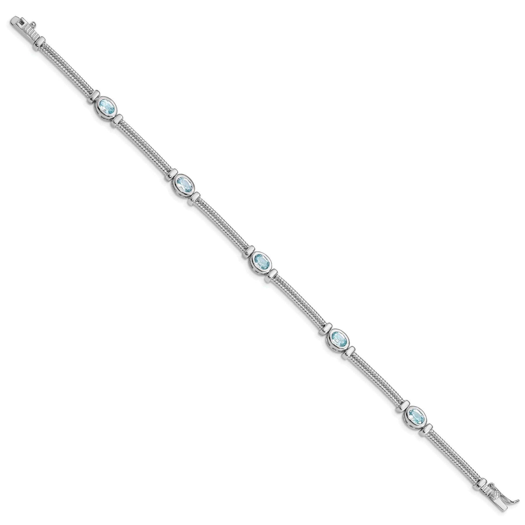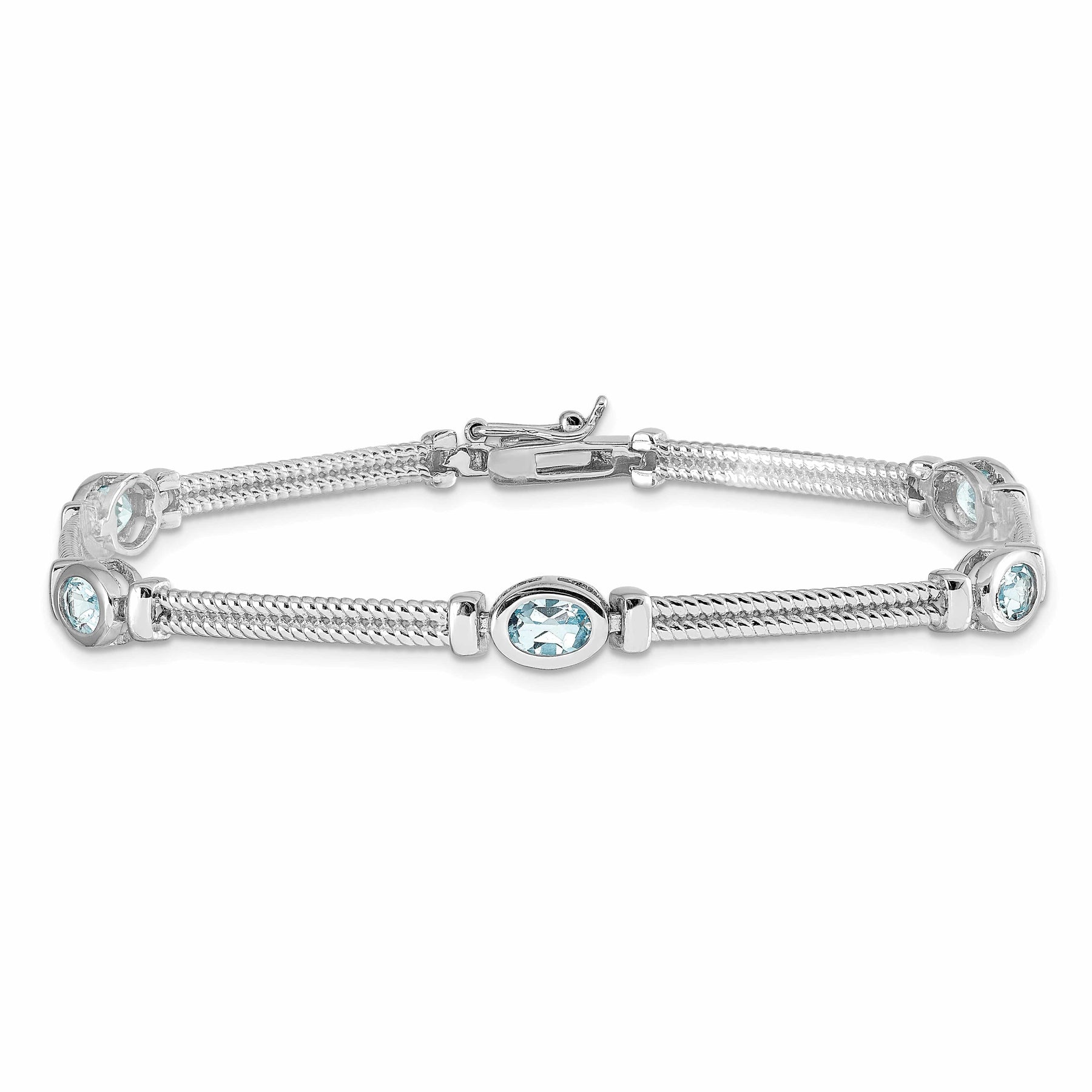 Introducing our stunning Sterling Silver Oval Stones Blue Topaz Gemstone Bracelet, a luxurious and elegant piece that will elevate any outfit. Crafted from high-quality sterling silver with a polished rhodium plated textured finish, this bracelet exudes sophistication and charm.