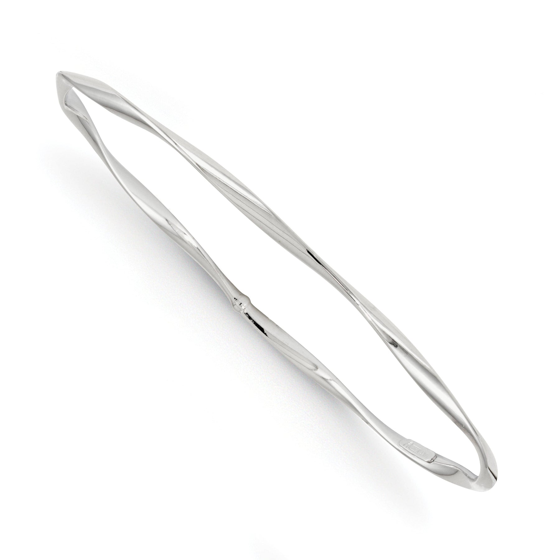 Introducing Leslie's exquisite 14kt White Gold Polished Twisted Slip On Bangle, a stunning piece of jewelry that is sure to add an elegant touch to any outfit. Crafted from high-quality 14kt white gold, this bangle features a contemporary twist design that will beautifully complement any style.