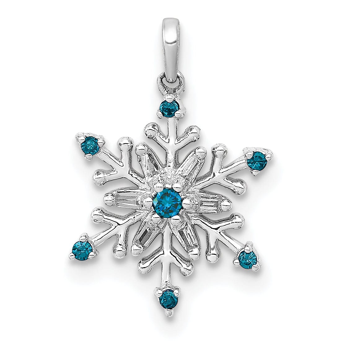 The intricate snowflake design symbolizes beauty and individuality, reflecting the uniqueness of every snowflake that falls from the sky. At its heart, this pendant showcases a carefully selected 1/10 carat blue diamond, surrounded by an array of shimmering white diamonds. Together, they create a breathtaking contrast that captures the light beautifully, making this pendant an eye-catching addition to any jewelry collection.