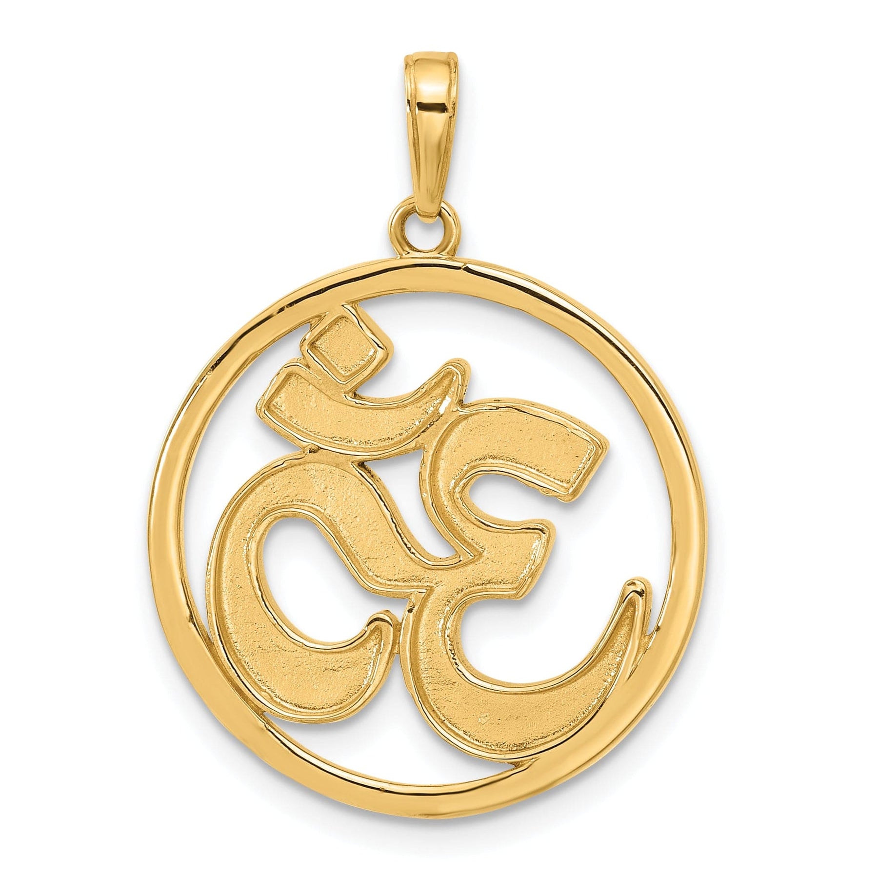 Elevate your jewelry collection with our exquisite 14K Two Tone Gold D.C Om Symbol in Circle Design Pendant. Crafted from solid 14K yellow gold and finished with a polished diamond-cut texture, this pendant beautifully combines elegance and spirituality. Measuring 30.75 mm in length and 22.5 mm in width, it features a sturdy bail for easy attachment to your favorite chain. Weighing 3.97 grams, this stunning piece is both durable and lightweight, making it a perfect accessory for any occasion. Embrace the harmony of design and meaning with this striking pendant.