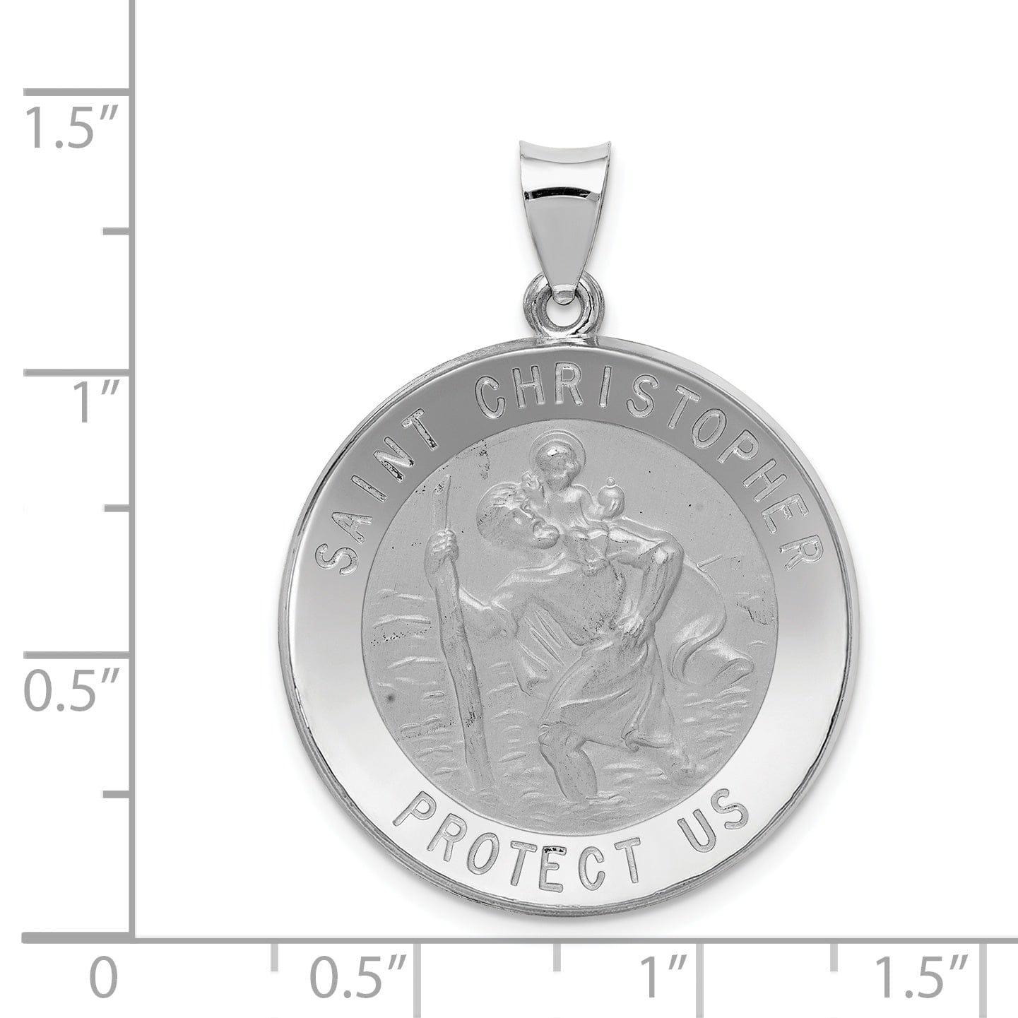 Elevate your style with this stunning 14k White Gold Saint Christopher Medal Pendant. Crafted with the finest materials, this polished satin finish pendant features a hollow 14k white gold design, adding a touch of luxury to any ensemble.