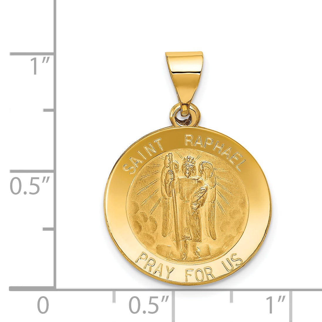 The 14k Yellow Gold Saint Raphael Medal Pendant is a stunning piece that beautifully showcases devotion to Saint Raphael, the archangel known for his healing powers and protection. This exquisite pendant is made from high-quality 14k yellow gold with a polished and satin finish, giving it a luxurious and elegant look.