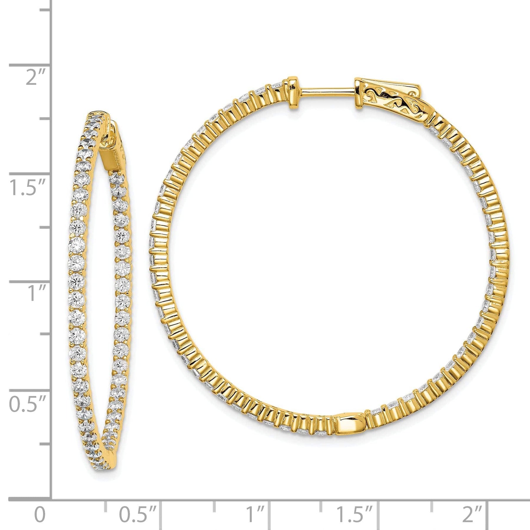 The unique "in and out" design of these hoop earrings ensures that the stones are visible both on the outside and inside of the hoops, creating a truly eye-catching look. With an average weight of 8.8 grams and a width of 42mm, these earrings are lightweight and comfortable to wear, making them perfect for day-to-night wear.