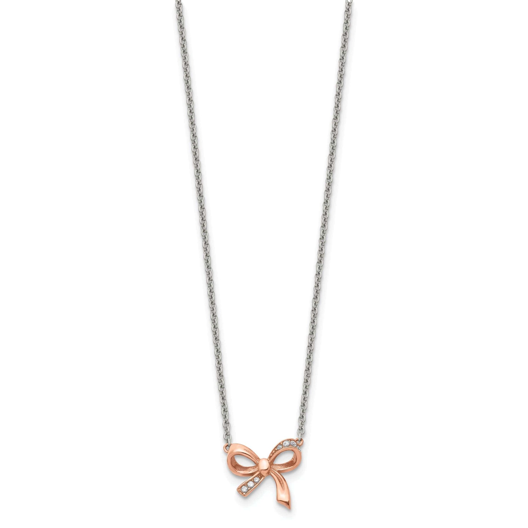 The necklace comes with a 16-inch chain, allowing you to adjust the length to your preference. Whether you wear it on its own or layer it with other necklaces, this Stainless Steel Polished C.Z Bow necklace is sure to become a favorite in your jewelry collection. Add a touch of elegance and sparkle to your look with this timeless piece.
