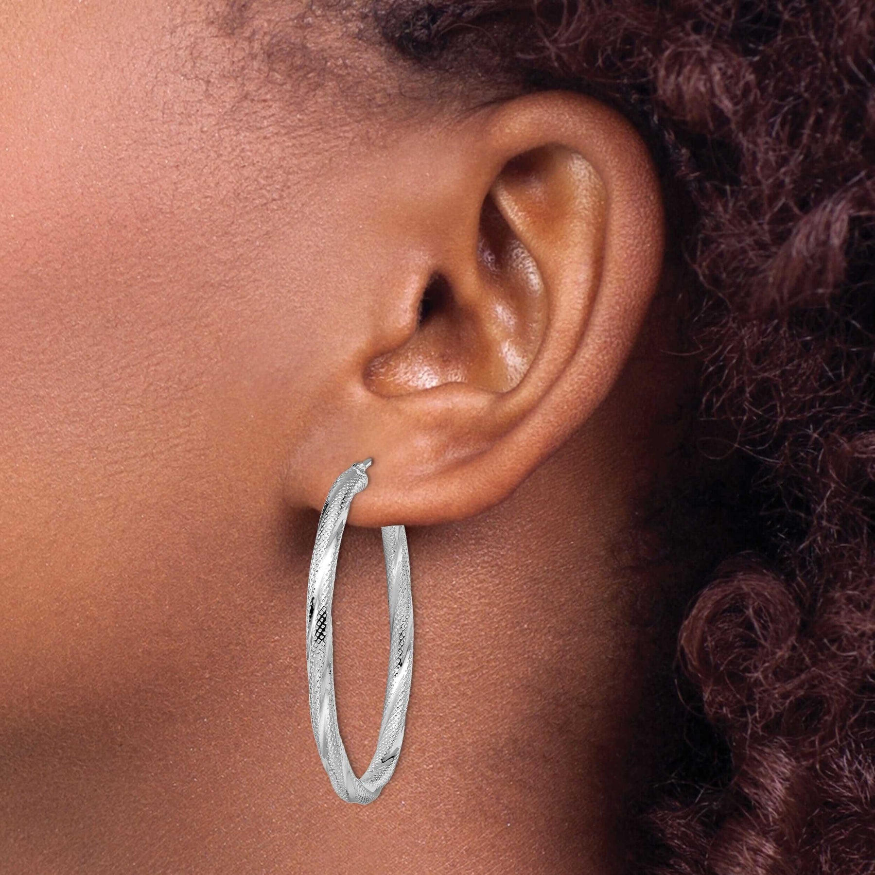 Enhance your jewelry collection with these stunning 10kt white gold twisted hinged hoop earrings. Crafted from high-quality 10kt white gold, these earrings feature a unique twisted design that adds a touch of elegance and sophistication to any outfit. The textured polished satin finish gives these earrings a luxurious look that is sure to turn heads.