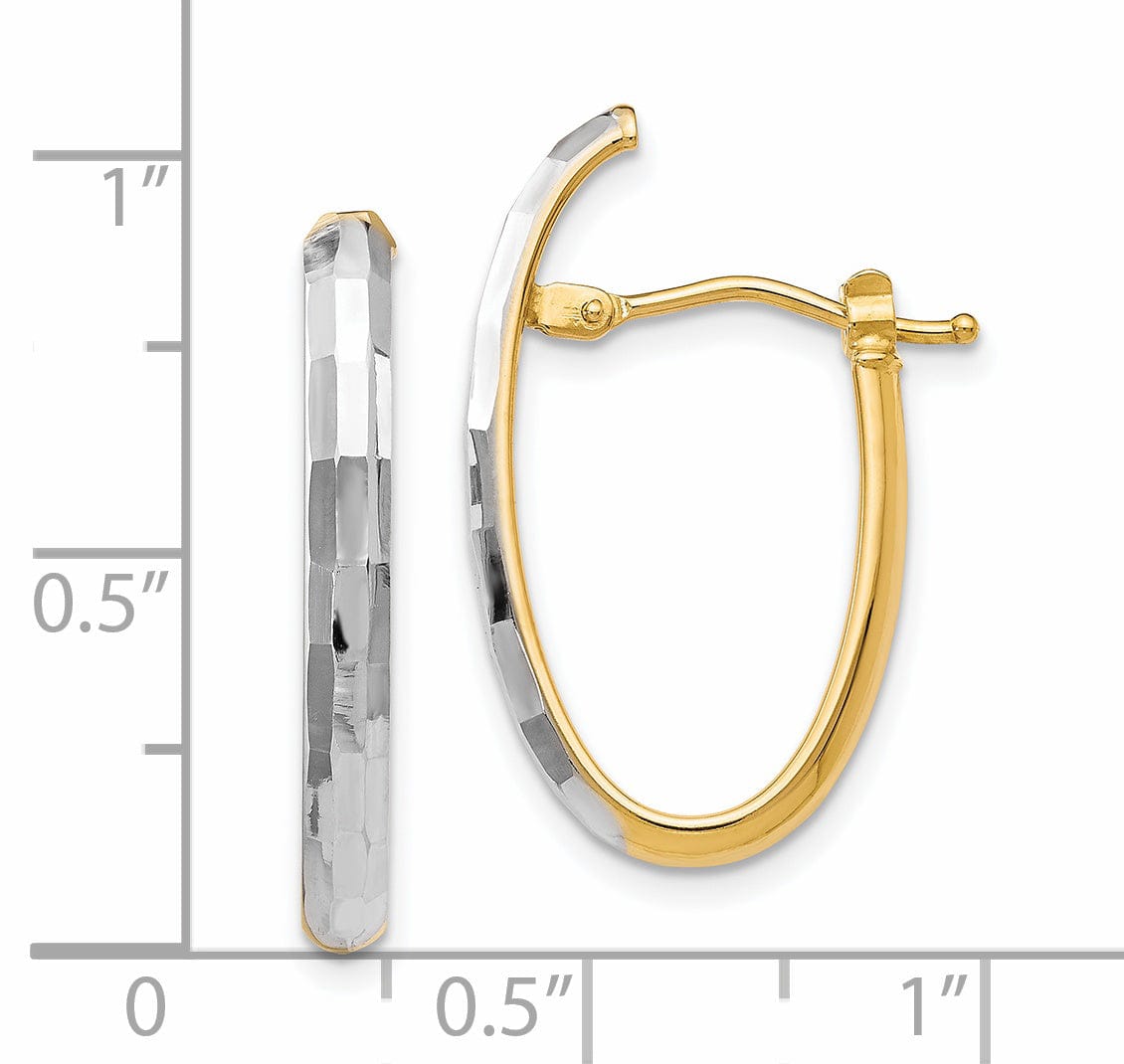 Made with 14k two tone gold, these earrings feature a unique diamond cut design that catches the light beautifully, adding a touch of sparkle to your look. The hinged design allows for easy and secure closure, ensuring that these earrings stay in place all day long.