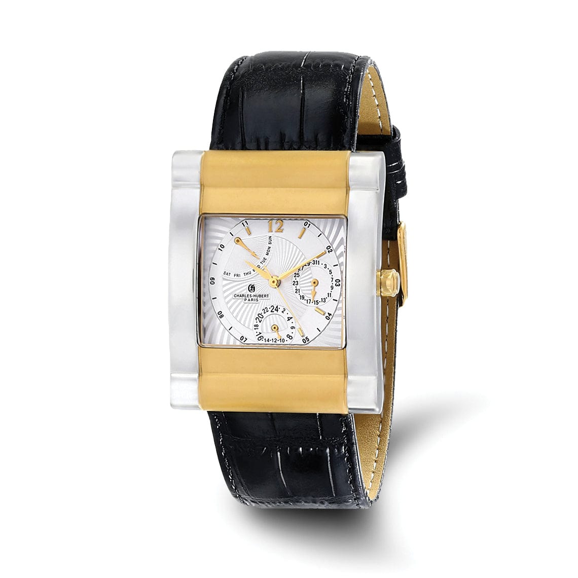 The Charles Hubert Classic Stainless Steel White Dial Watch combines elegance and functionality in one timeless piece. Featuring a polished, two-tone yellow IP-plated stainless steel case, this watch is complemented by a crisp white dial with day and date display. Its durable leather band ensures a comfortable fit, measuring 8.5 inches in length and 24 mm in width. With a thickness of 10 mm, this watch is designed for everyday wear while making a stylish statement. Perfect for any occasion, this classic timepiece embodies sophistication and reliability.