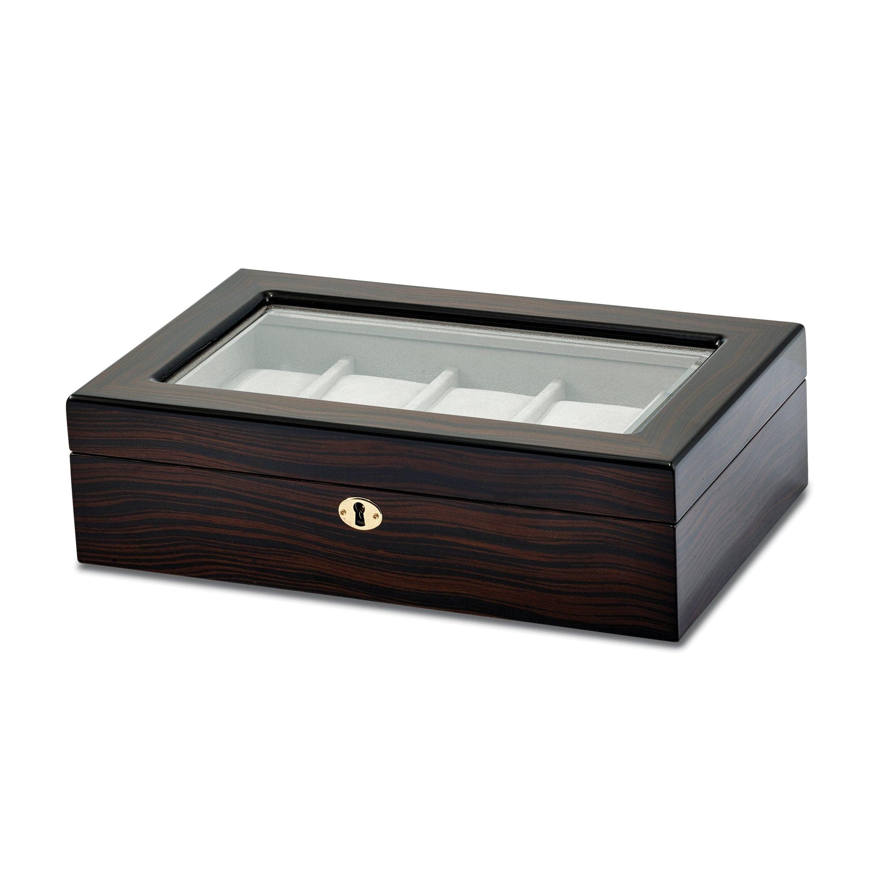 Measuring 8.25 inches in width, this case provides ample space for up to 10 watches, making it ideal for both collectors and casual watch enthusiasts alike. Treat yourself to the ultimate watch storage solution with our High Gloss Ebony Finish Locking 10-Watch Case.