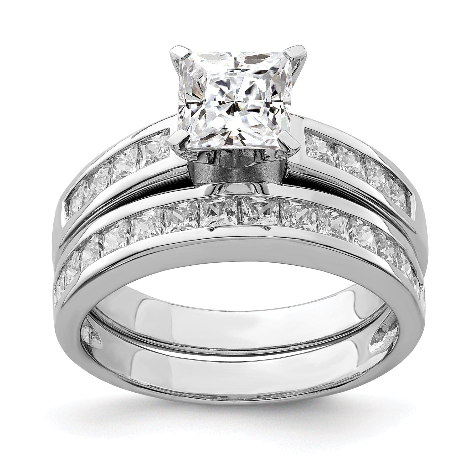 The main ring features a large brilliant-cut cubic zirconia stone in the center, surrounded by smaller stones along the band for added shine and glamour. The matching band ring is adorned with a row of shimmering cubic zirconia stones, creating a harmonious and sophisticated set that will complement any outfit.