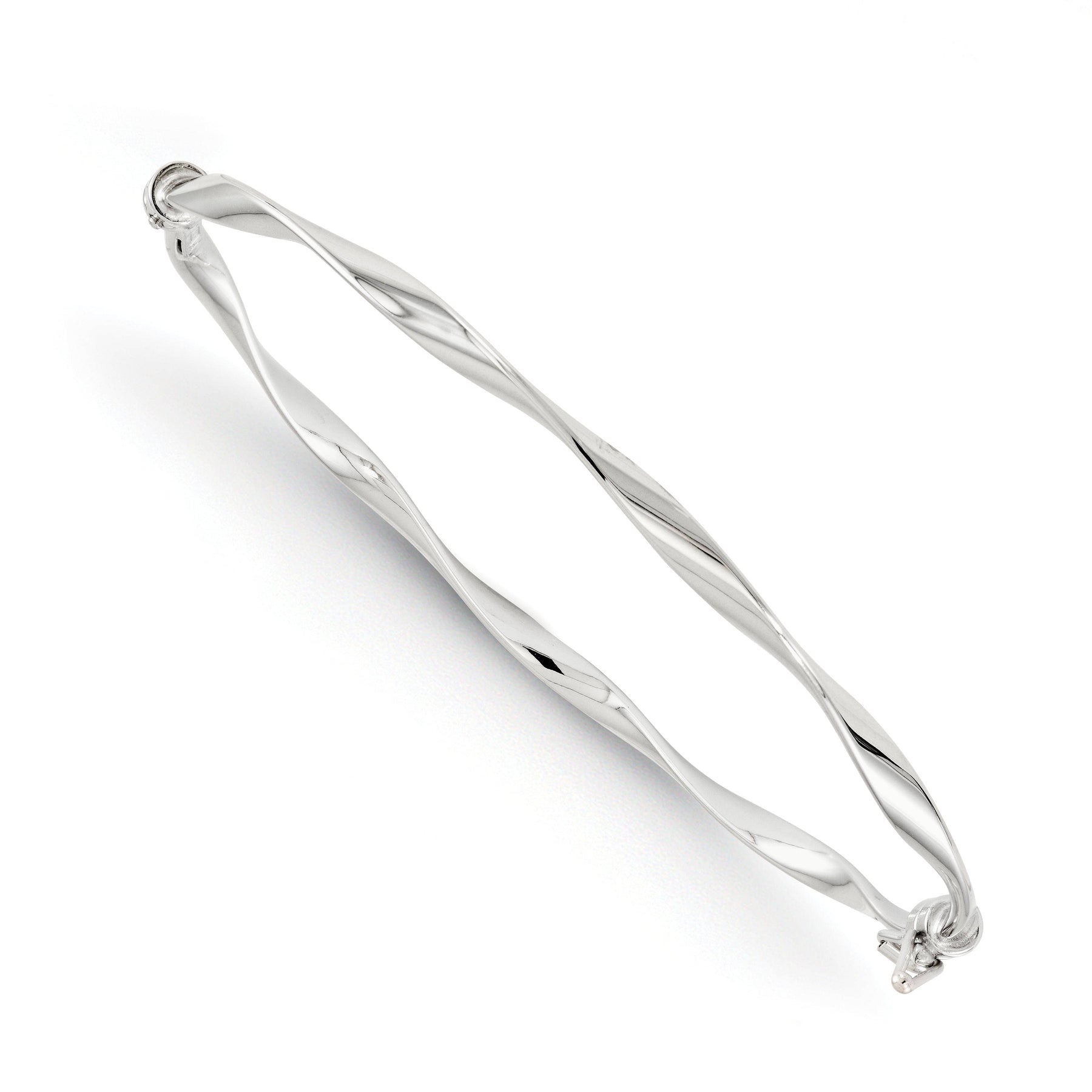 The twisted design adds a unique touch to the classic hinged bangle style, making it a standout piece in your jewelry collection. The high-polished finish gives it a radiant shine that catches the light from every angle, adding a touch of glamour to your look.