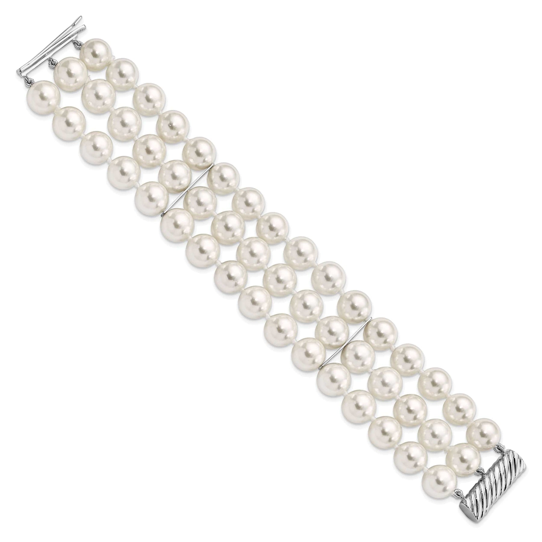 Crafted from high-quality sterling silver and finished with a polished rhodium plating, this bracelet exudes a radiant shine that is sure to turn heads. The bracelet features three strands of lustrous 10-11mm white shell pearl beads, adding a touch of sophistication to any outfit.