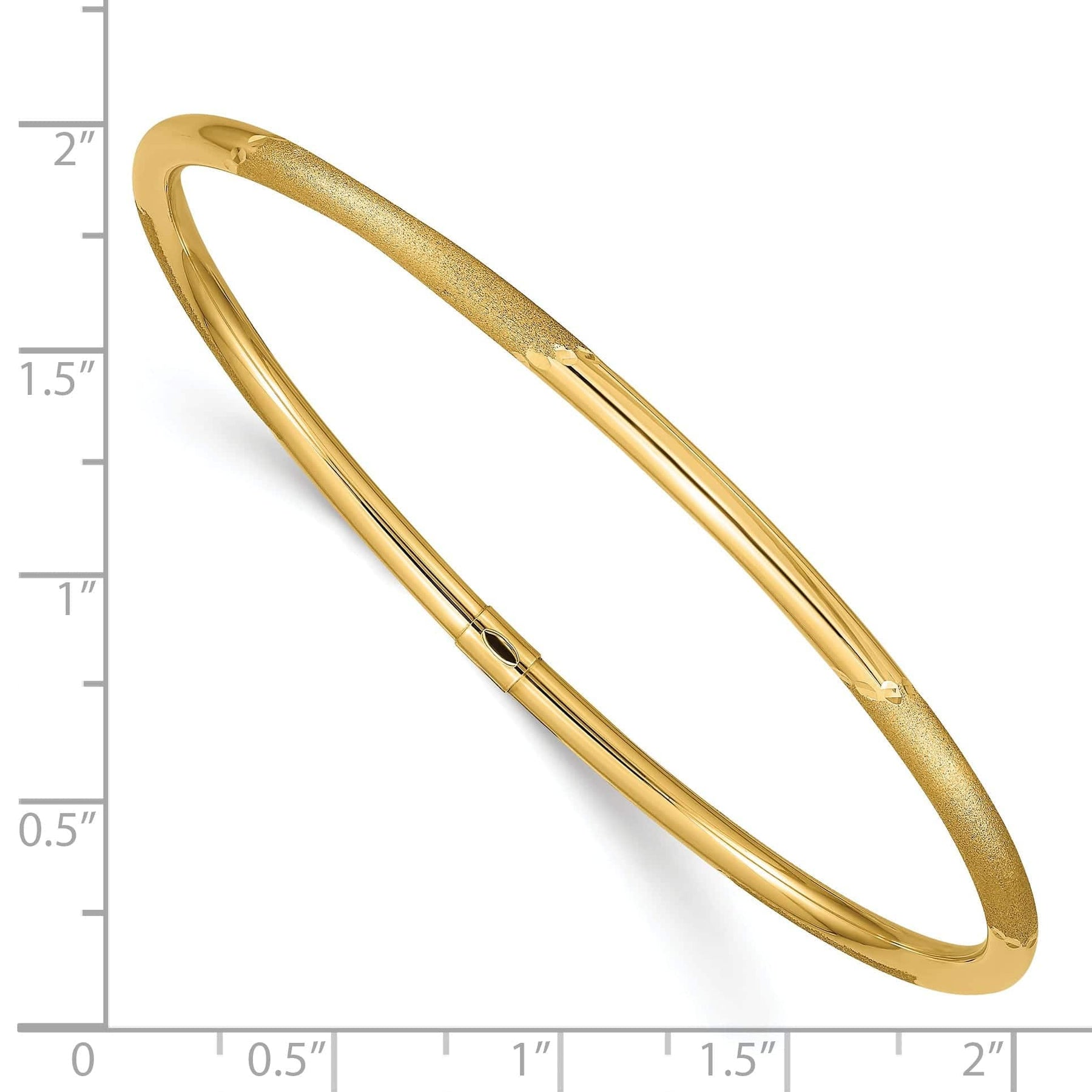 Introducing our luxurious 14k Yellow Gold Slip-on Bangle, expertly crafted for the sophisticated and stylish woman. Made from the finest quality 14k yellow gold, this bangle features a stunning combination of polished and satin finishes, adding a touch of elegance to any outfit.