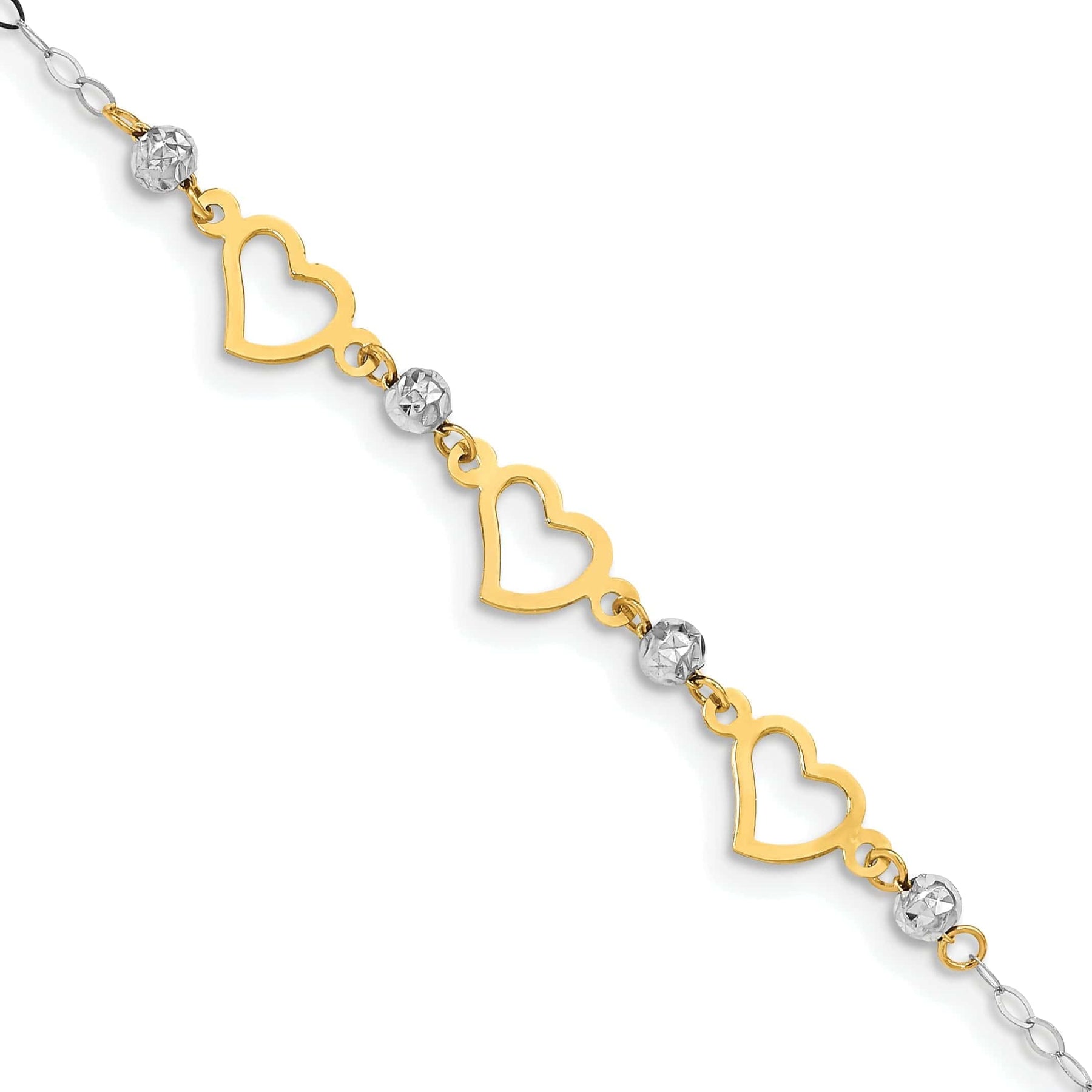 Add a touch of elegance to your ensemble with our exquisite 14K two-tone gold bracelet. Crafted with precision and care, this stunning piece features a captivating diamond-cut polished finish that catches the light exquisitely. The intricate beads and heart design add a unique and charming touch to this 7.5-inch bracelet, making it a standout accessory for any occasion.
