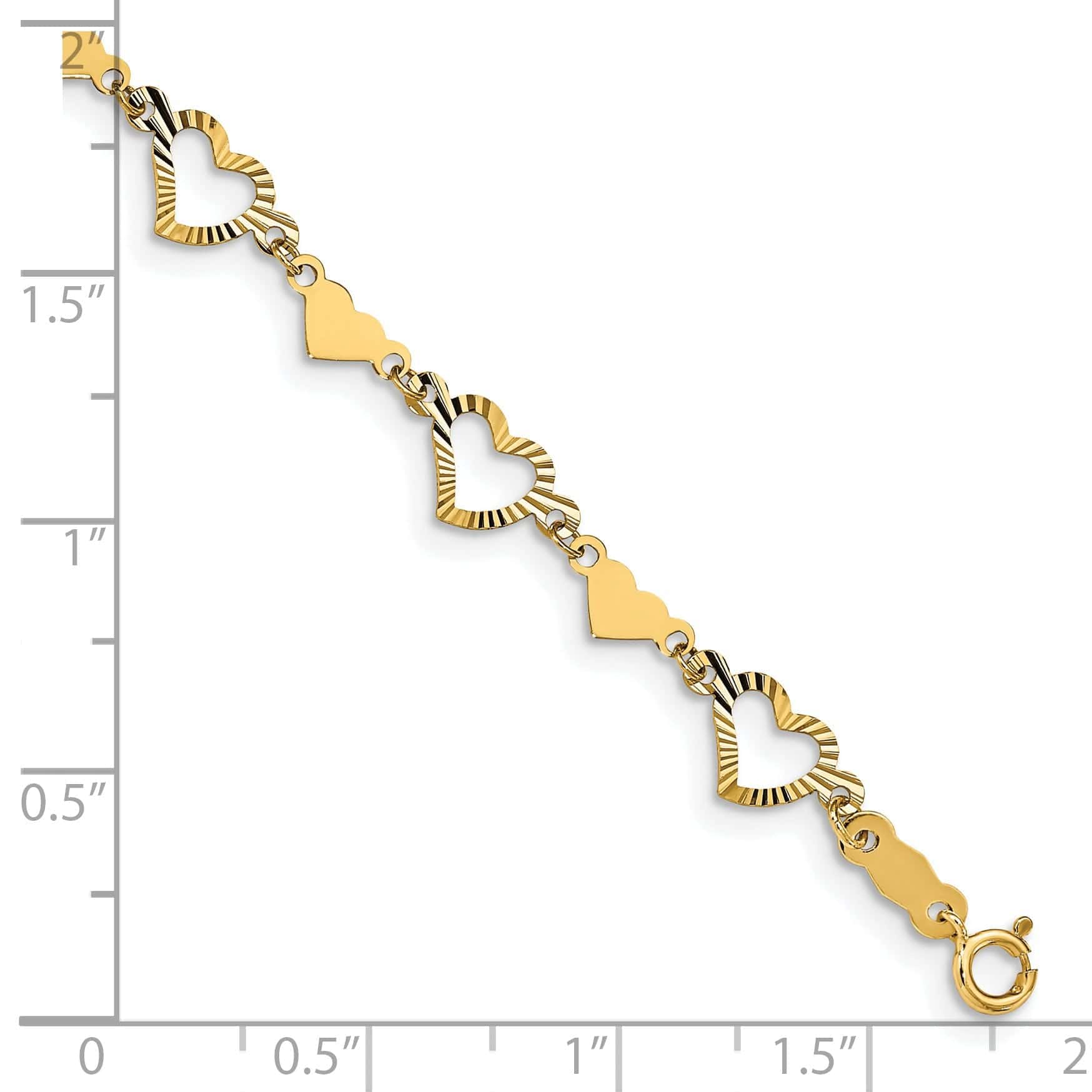 Add a touch of elegance and sophistication to your ensemble with our stunning 14k yellow gold bracelet. Crafted from high-quality 14k yellow gold, this bracelet features a polished diamond-cut finish that glimmers beautifully in the light. The open cut out design of the bracelet is accented by delicate multi-heart details, adding a romantic and feminine touch to the piece.
