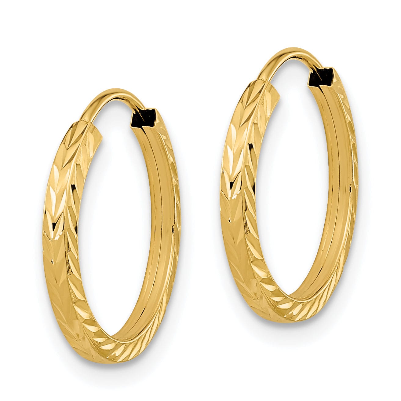 Elevate your style with these stunning 14K Yellow Gold Sleek D.C Square-Tube Endless Hoop Earrings. Crafted from solid 14K yellow gold, these earrings boast a polished finish and a unique diamond-cut texture that adds a touch of elegance. Measuring 15mm in length and 1.35mm in width, they are designed for comfort and durability. Perfect for any occasion, these timeless hoops are a must-have addition to your jewelry collection.
