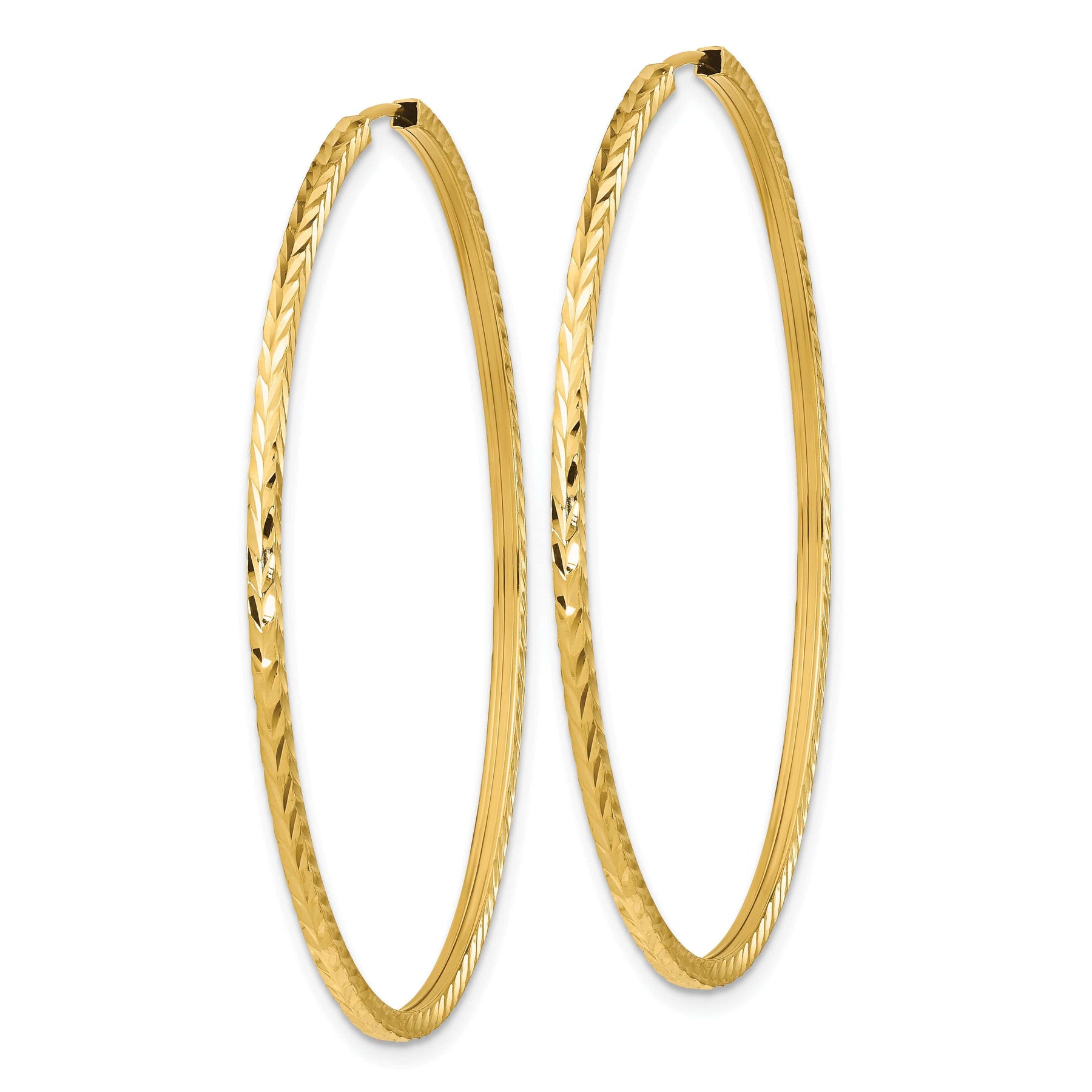Elevate your style with our stunning 14K Yellow Gold Chic D.C Square-Tube Endless Hoop Earrings. Crafted from solid 14K yellow gold, these earrings feature a polished finish and a unique diamond-cut texture that adds a touch of sophistication. Measuring 50mm in length and 1.35mm in width, they are lightweight at just 2.21 grams, making them perfect for everyday wear or special occasions. Embrace elegance with these timeless hoops, available individually for your convenience.