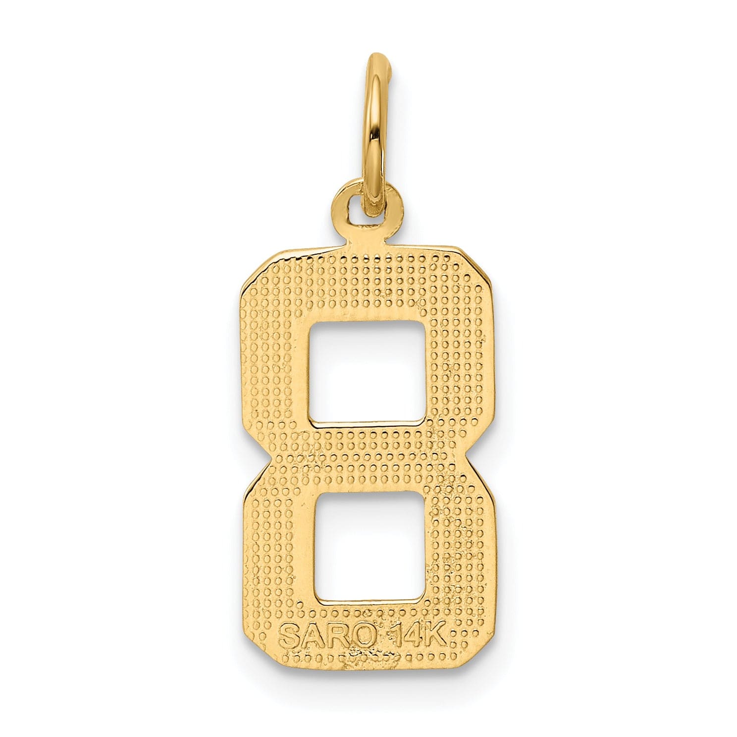 Die Goldreinheit ist mit 14K garantiert, was ein hochwertiges Stück sicherstellt, das nicht anläuft oder seinen Glanz im Laufe der Zeit verliert. Die Zahl 8 hat für viele eine besondere Bedeutung und symbolisiert Fülle, Erfolg und Errungenschaften. Ob Sie diesen Anhänger als persönlichen Talisman tragen oder als durchdachtes Geschenk für einen geliebten Menschen wählen, er wird mit Sicherheit geschätzt.