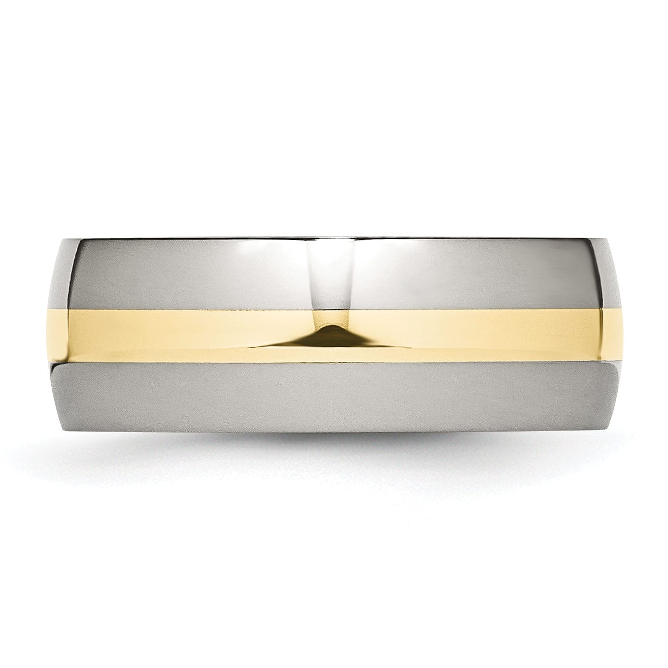 Esta alianza tiene un ancho de 8 mm, lo que la convierte en la pieza ideal para destacar en cualquier ocasión. Ya sea que se vista para un evento especial o simplemente desee añadir un toque de glamour a su look diario, esta alianza seguro causará impresión. La combinación de acero inoxidable y oro de 14k crea una pieza atemporal y versátil que nunca pasará de moda.