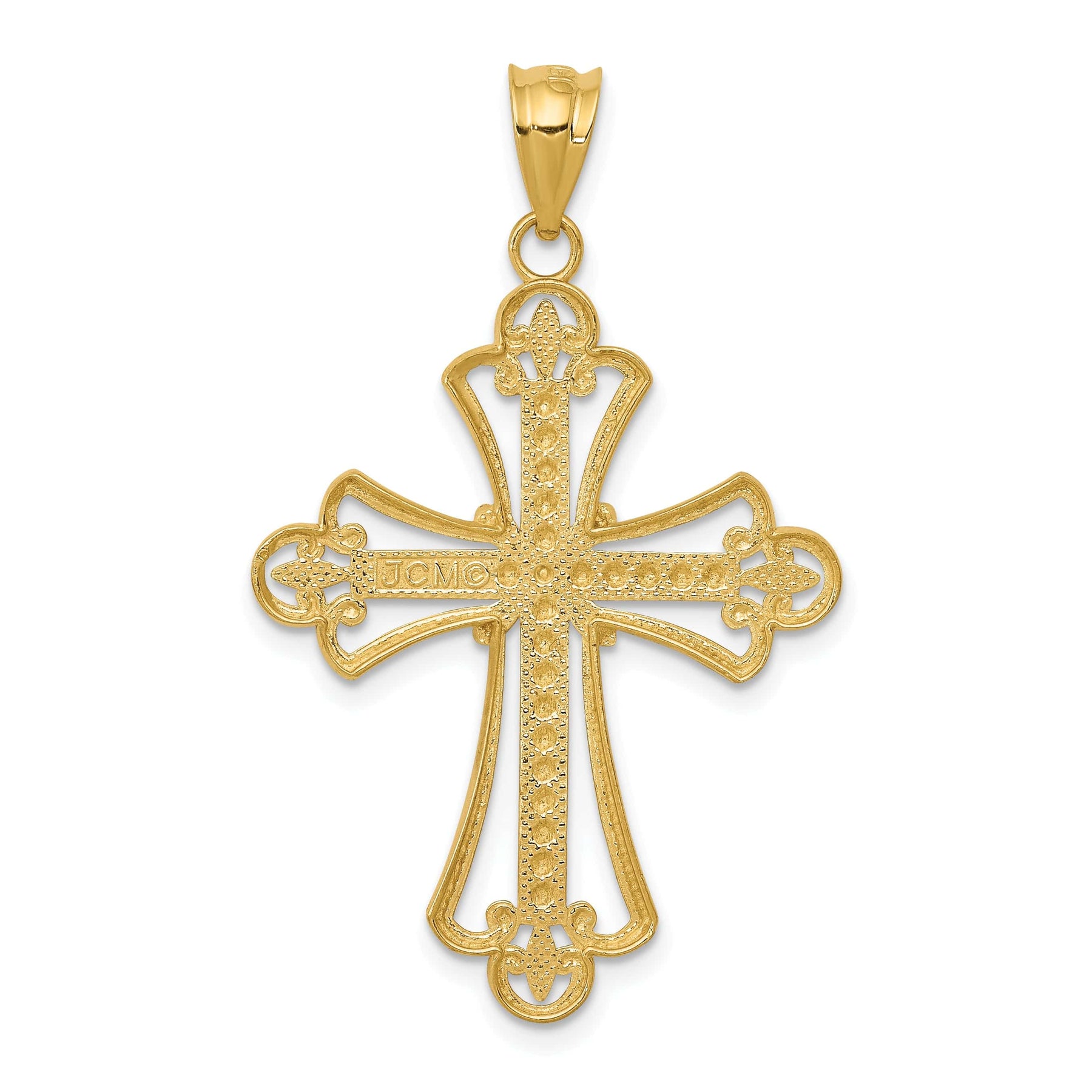 Eleve su colección de joyas con nuestro impresionante colgante clásico de cruz Fleur de Lis con capullos en oro bicolor 14K. Elaborado en oro amarillo macizo 14K y elegantemente complementado con un baño de rodio, este colgante pulido presenta un diseño de cruz con capullos bellamente detallado. Con un peso de solo 1.68 gramos y unas medidas de 38 mm de largo y 22 mm de ancho, es la pieza perfecta para cualquier ocasión. Con una longitud de asa de 7.2 mm y un ancho de 3.7 mm, se combina fácilmente con sus cadenas favoritas. Celebre su fe con un toque de lujo.