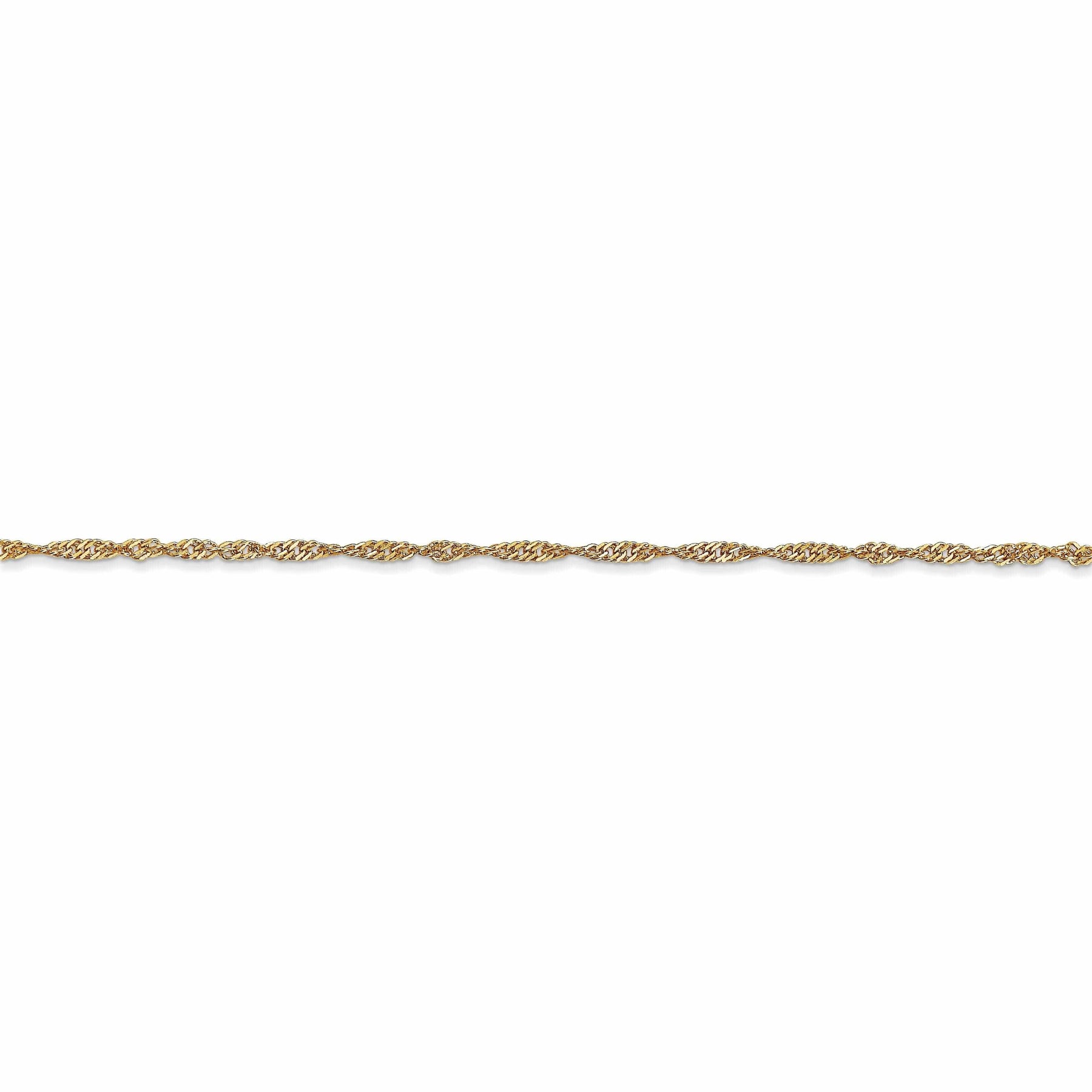 Ya sea que te vistas para una ocasión especial o simplemente desees añadir un toque de lujo a tu vestuario diario, la cadena Singapur en oro amarillo de 10k de Leslie es la elección perfecta. Con su construcción duradera y diseño clásico, esta cadena seguramente se convertirá en un elemento básico de tu colección de joyas. Date un gusto o regala a un ser querido esta pieza deslumbrante hoy mismo y experimenta la elegancia y el lujo de las finas joyas de Leslie.