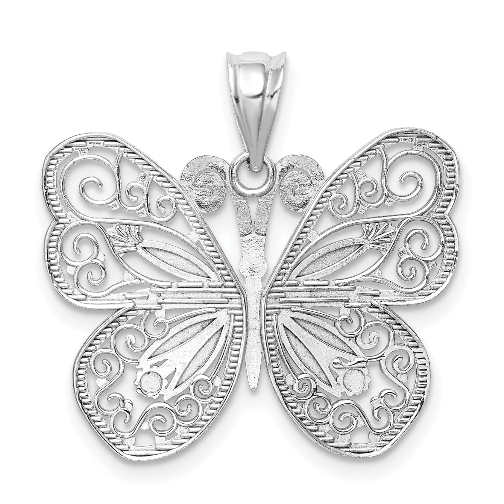 Bigyan ang iyong sarili ng kahanga-hangang 14K White Gold Casted Solid Polished Finish Diamond-cut Butterfly Charm Pendant na ito at dagdagan ang ganda ng iyong pang-araw-araw na anyo.