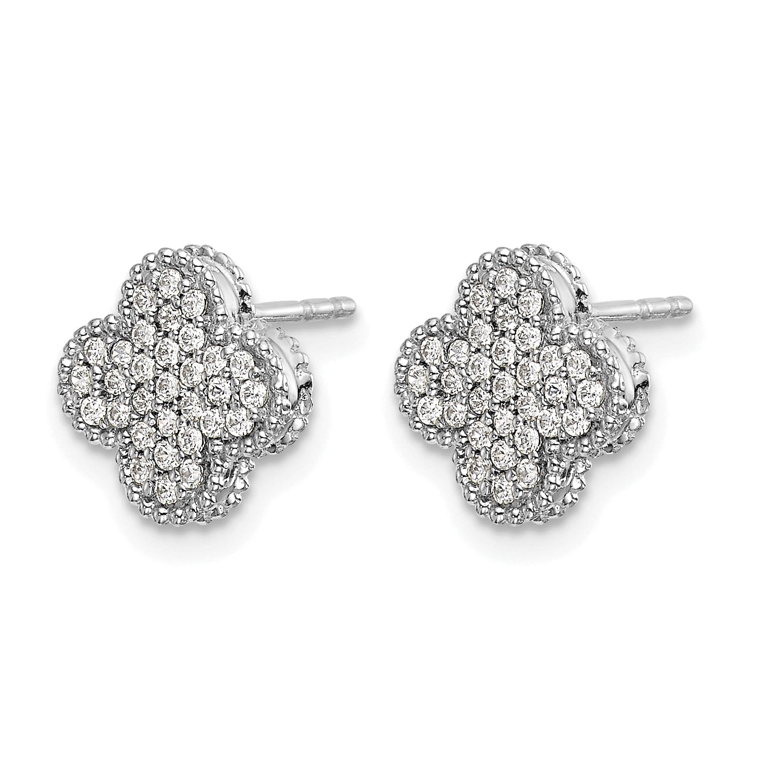 Itaguyod ang iyong kariktan gamit ang aming 14k Puti na Ginto 1/3 CT Pave Diamante na Disenyong Quatrefoil na Hikaw. Gawa mula sa matibay na 14K puting ginto at tinapos ng makintab na rhodium plating, ang mga kahanga-hangang hikaw na ito ay may maselang disenyo ng quatrefoil na pinalamutian ng 54 na kumikislap na pave na diamante. May sukat na 10 mm ang haba at lapad, nag-aalok ito ng magandang pahayag habang nananatiling magaan sa bigat na 1.49 gramo lamang. Perpekto para sa anumang okasyon, ang mga hikaw na ito ay nagdadagdag ng isang haplos ng kariktan sa iyong koleksyon ng alahas.