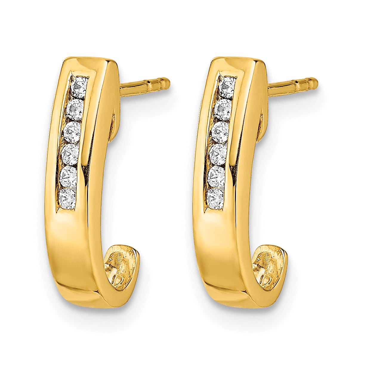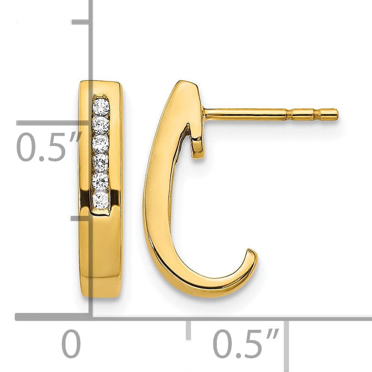 Itanghal ang iyong estilo gamit ang mga kahanga-hangang 14k Dilaw na Gintong 1/10 CT Diamanteng Channel J-Hoop Post na Hikaw. Gawa mula sa matibay na 14K dilaw na ginto, ang mga pinakinis na hikaw na ito ay may makinis na disenyo na pinalamutian ng 12 kumikislap na diamante, na pinagsasama ang kariktan at tibay. Sa magaan na bigat na 1.85 gramo lamang, ang sukat na 14 mm ang haba at 7 mm ang lapad ay ginagawang perpektong palamuti para sa anumang okasyon. Magningning nang maliwanag sa kahanga-hangang karagdagang ito sa iyong koleksyon ng alahas.