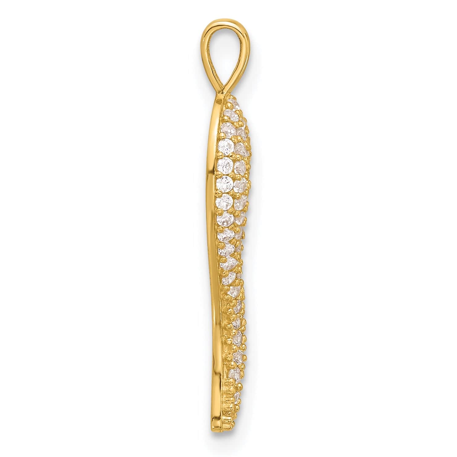 Itanghal ang iyong estilo gamit ang aming kahanga-hangang 14k Dilaw na Gintong Pinakintab na C.Z Malaking Italian Horn Pendant. Gawa mula sa matibay na 14K dilaw na ginto, ang napakagandang pendant na ito ay may pinakintab na tapusin na kumikislap nang maliwanag. May bigat na 0.67 gramo, ito ay may sukat na 25 mm ang haba, 6.7 mm ang lapad, at 2.5 mm ang kapal, na ginagawang perpektong piraso para sa anumang okasyon. Magdagdag ng halimuyak ng kariktan sa iyong koleksyon ng alahas gamit ang pambihirang pendant na ito, na dinisenyo upang tumagal sa paglipas ng panahon.