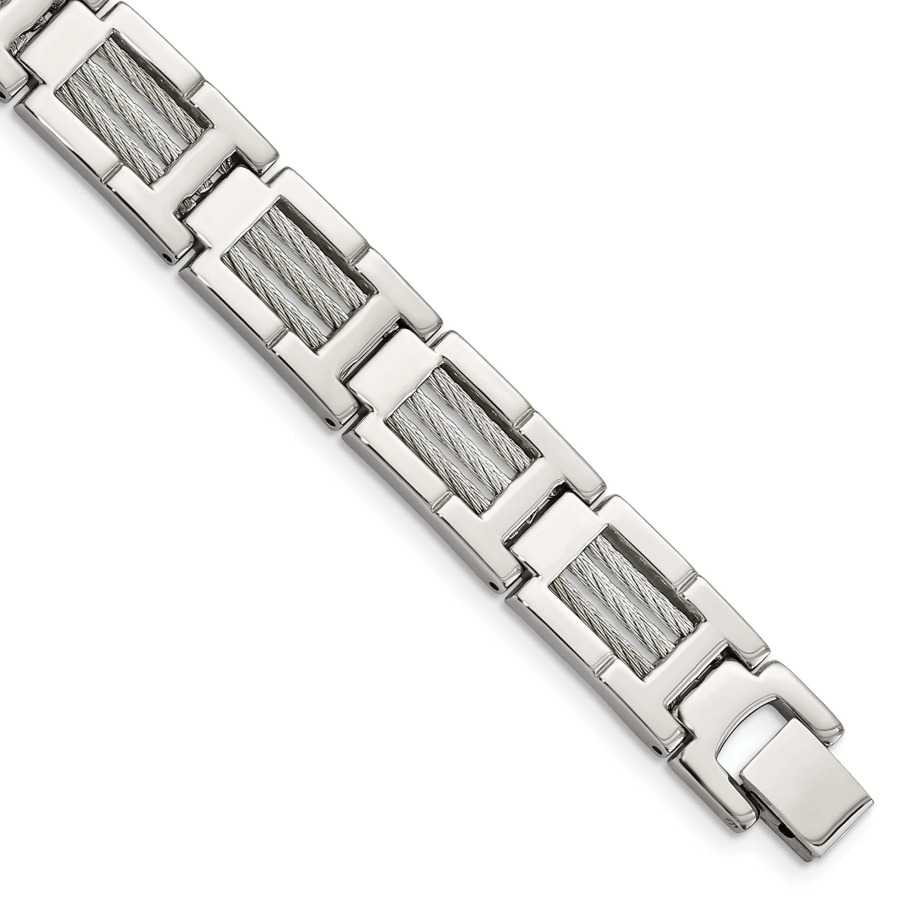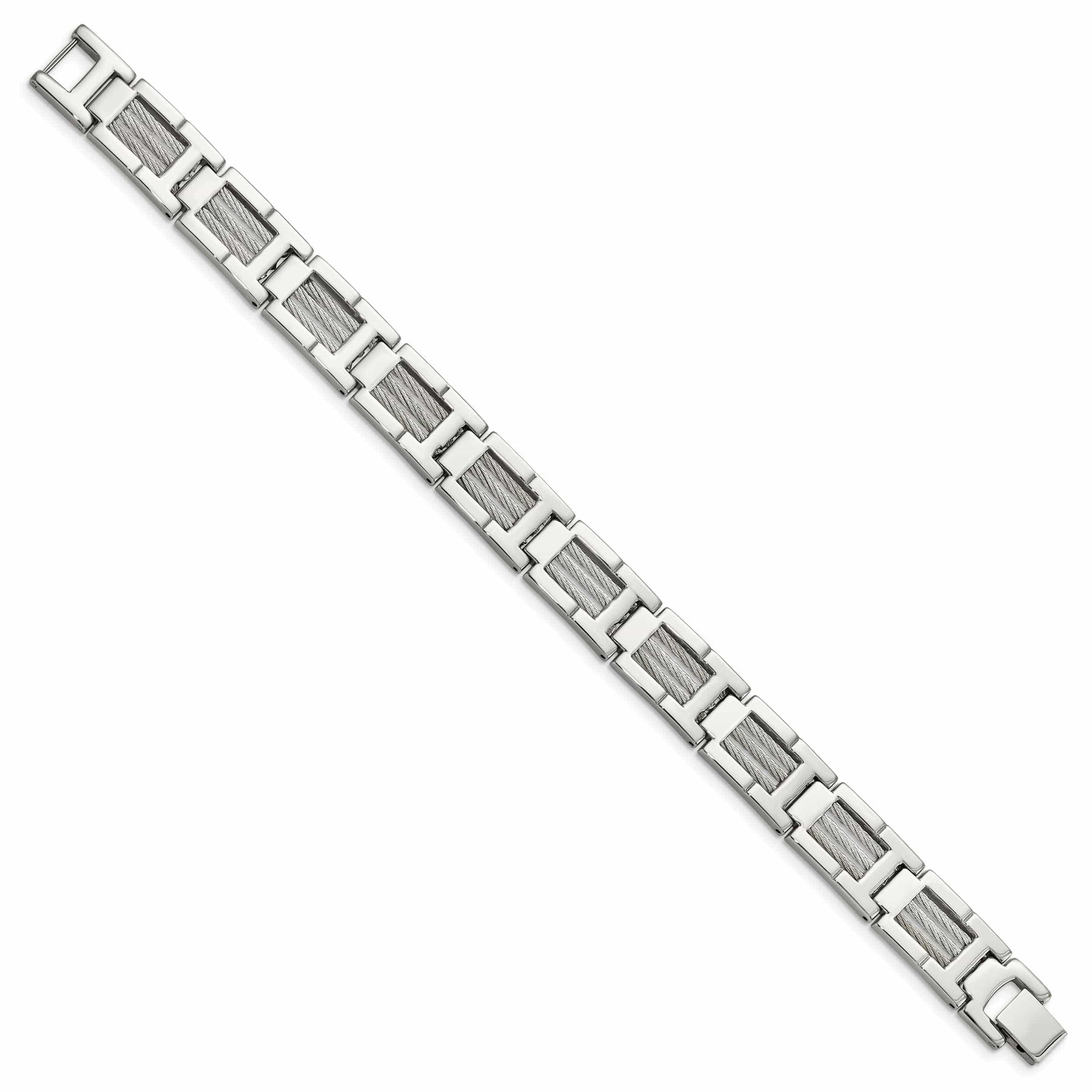 Magdagdag ng bahagyang kinang sa iyong koleksyon ng mga alahas gamit ang aming Stainless Steel Grey Cable Fold Over Bracelet. Gumawa ng pahayag at magpatingkad sa karamihan gamit ang kailangang-kailangang palamuting ito.