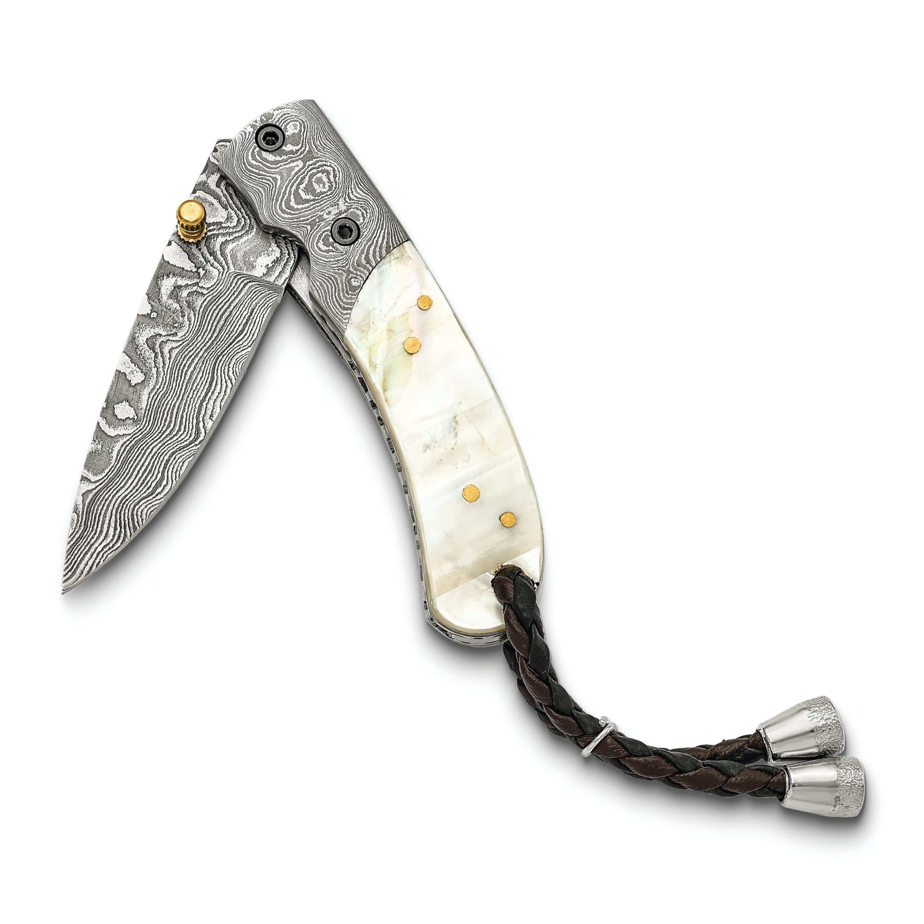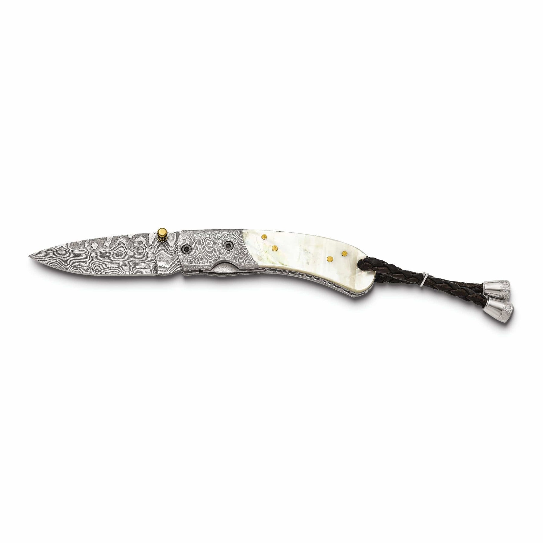 Le design à lame pliable ajoute une touche d'élégance et de fonctionnalité à ce couteau, le rendant parfait pour un port quotidien ou des occasions spéciales. Le manche en nacre apporte une note luxueuse et sophistiquée, créant un contraste saisissant avec la lame en acier de Damas.