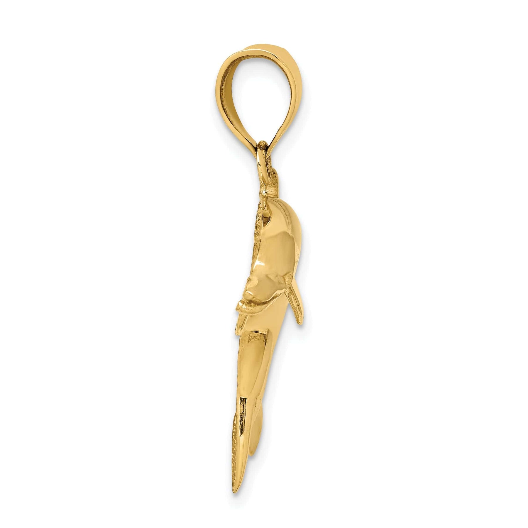 Apportez une touche ludique et élégante à votre collection d'accessoires avec ce pendentif en forme de dauphin massif en or jaune 14 carats, coulé et fini poli. Commandez le vôtre dès aujourd'hui et emportez un peu de l'océan avec vous où que vous alliez.