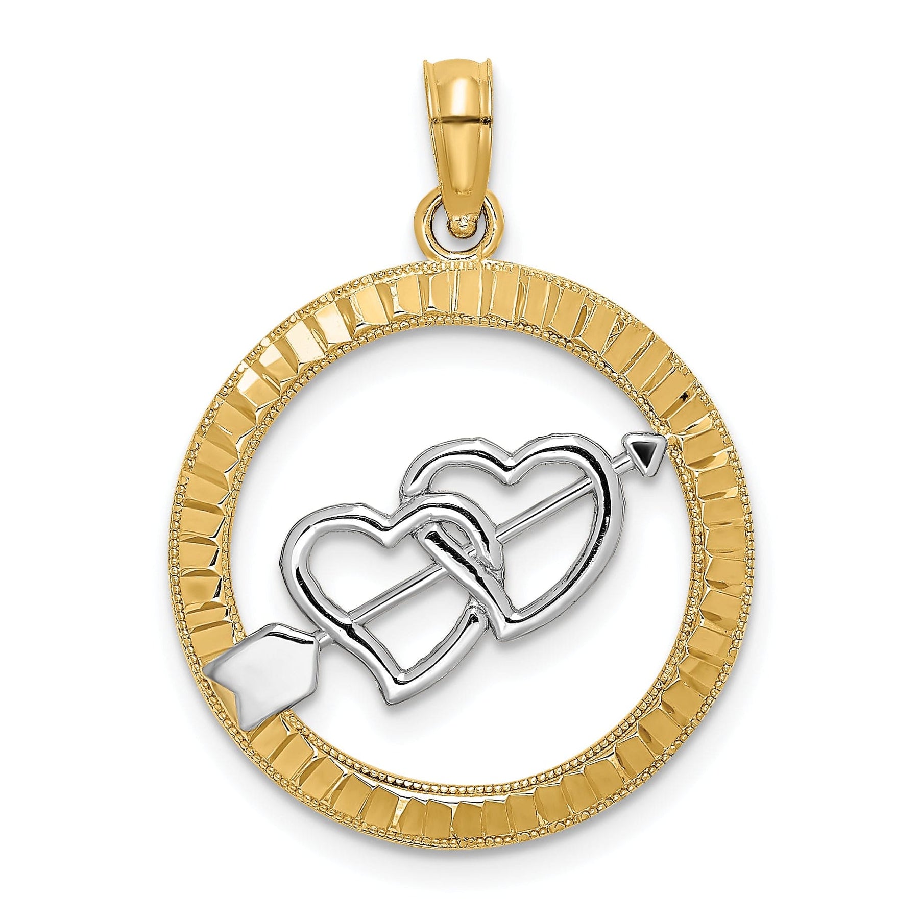 Le pendant du pendentif mesure 5 mm de longueur et 4,5 mm de largeur, vous permettant de l’attacher aisément à votre chaîne préférée. La pureté de l’or est garantie par un poinçon 14K, assurant que vous obtenez une pièce de bijouterie de haute qualité. Que vous souhaitiez vous faire plaisir ou offrir un cadeau à un être cher, ce pendentif cœur et flèche D.C en or jaune 14 carats rhodié est un choix intemporel et élégant qui sera chéri pendant de nombreuses années.