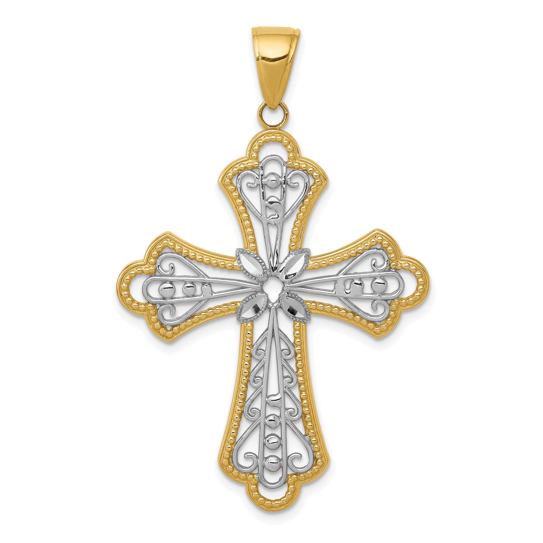 Élevez votre style avec notre pendentif croix Fleur de Lys classique en filigrane découpé, en or bicolore 14K. Cette pièce remarquable associe un or jaune 14K riche à une finition polie en rhodium blanc, mettant en valeur un motif en filigrane finement ciselé au diamant. Pesant 3,11 grammes, ce pendentif mesure 45 mm de longueur et 30 mm de largeur, en faisant un accessoire saisissant pour toute occasion. L’anneau de suspension offre une longueur pratique de 8,45 mm et une largeur de 5 mm, garantissant une grande polyvalence dans votre collection de bijoux. Parfait pour ceux qui apprécient l’élégance et le savoir-faire.