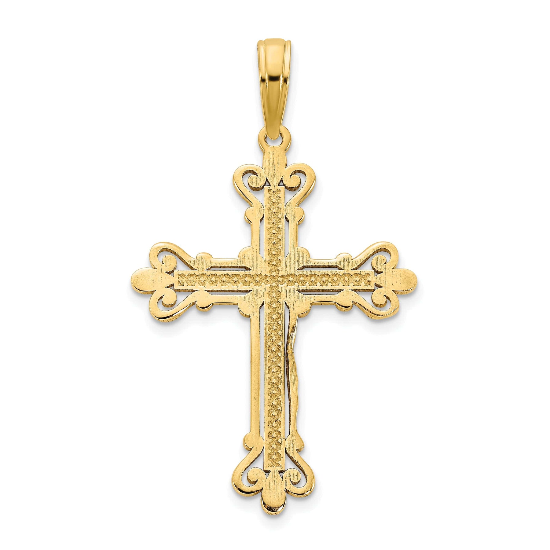 Élevez votre style avec le pendentif croix classique fantaisie Fleur de Lis en or jaune 14 carats. Cette pièce exquise est façonnée en or jaune massif 14 carats, présentant une finition polie qui dégage l'élégance. Avec son motif complexe de Fleur de Lis, ce pendentif attire le regard tout en conservant un charme intemporel. Pesant 1,38 gramme et mesurant 31,7 mm de longueur, il est à la fois léger et résistant. Un accessoire parfait pour toute occasion ou un cadeau attentionné pour un être cher.
