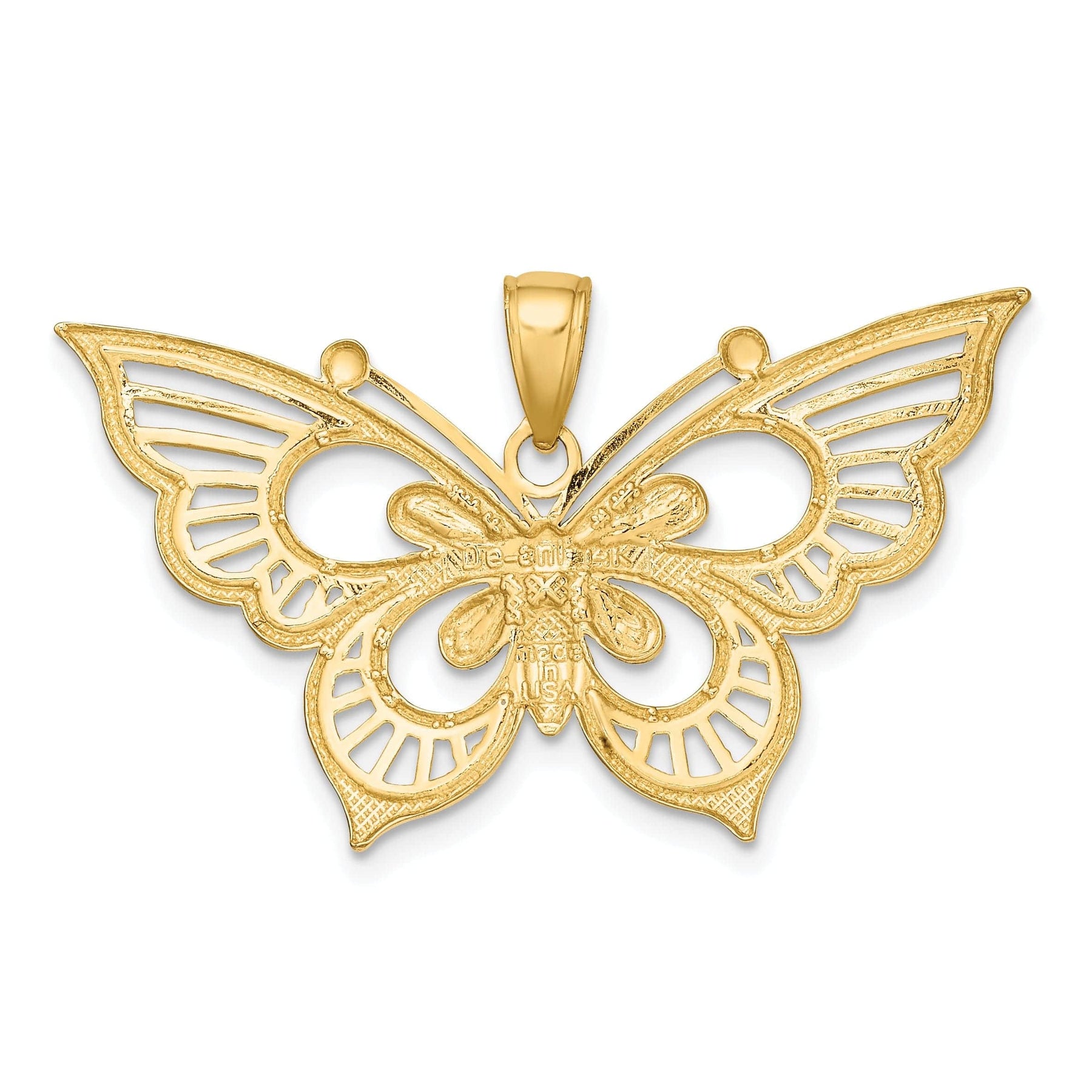 आज ही इस उत्कृष्ट 14k दो-रंगीन सोने के बनावट वाले पीछे वाले ठोस चमकदार हीरे-कट तितली आकर्षण लॉकेट से स्वयं को या अपने प्रियजन को सम्मानित करें और अपनी शैली को एक नई ऊँचाई पर ले जाएं।