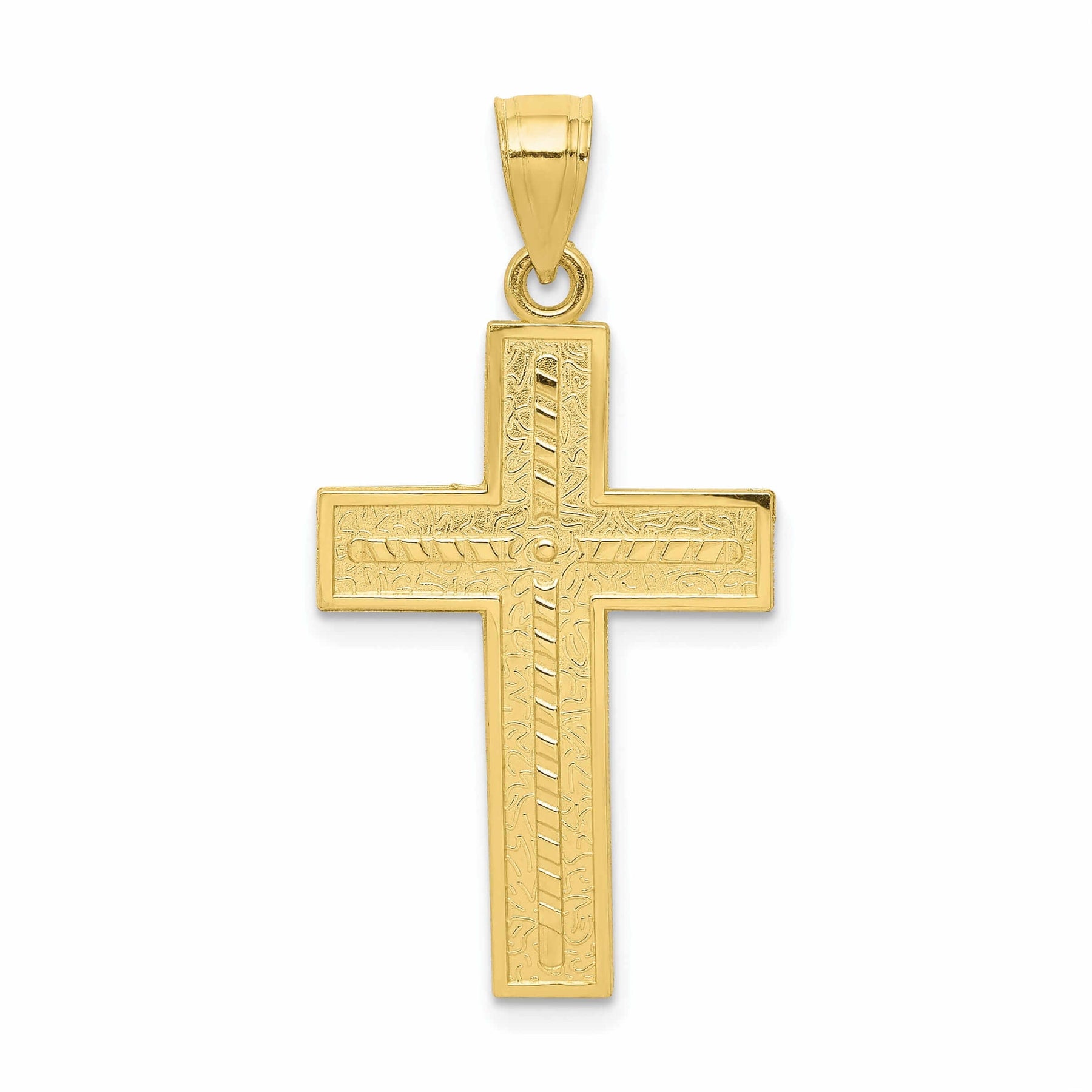 Sia che lo indossiate da solo o sovrapposto ad altre collane, questo ciondolo saprà esprimere uno stile raffinato. Aggiungete un tocco di eleganza a ogni abito con il nostro ciondolo a croce lucida in oro giallo 10k con finitura testurizzata, un accessorio indispensabile per chi apprezza le cose più raffinate della vita.
