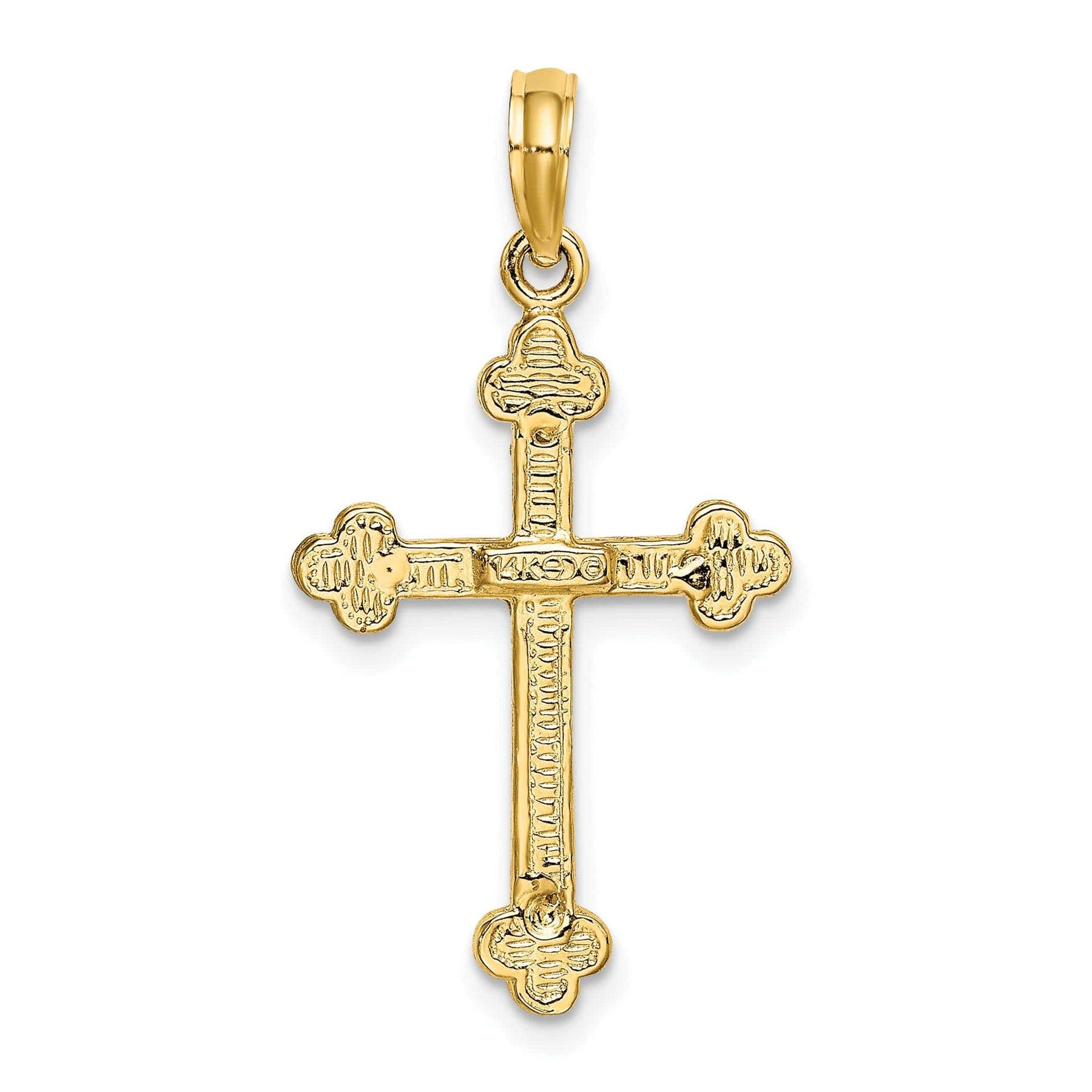 14Kイエローゴールドのクラシックな芽付き十字架ペンダントで、優雅さを高めましょう。純粋な14Kイエローゴールドで作られたこの時を超えた逸品は、磨き上げられた仕上げと光を美しく捉える繊細な模様が特徴です。重さは1.95グラム、長さ31.4mm、幅17mmで、印象的でありながら繊細な存在感を放ちます。十字架ペンダントには7mm×5mmのバチカンが付いており、お気に入りの鎖にしっかりと取り付けられます。信仰と様式の完璧な調和を成すこのペンダントは、どの宝飾品コレクションにも大切な一品となるでしょう。
