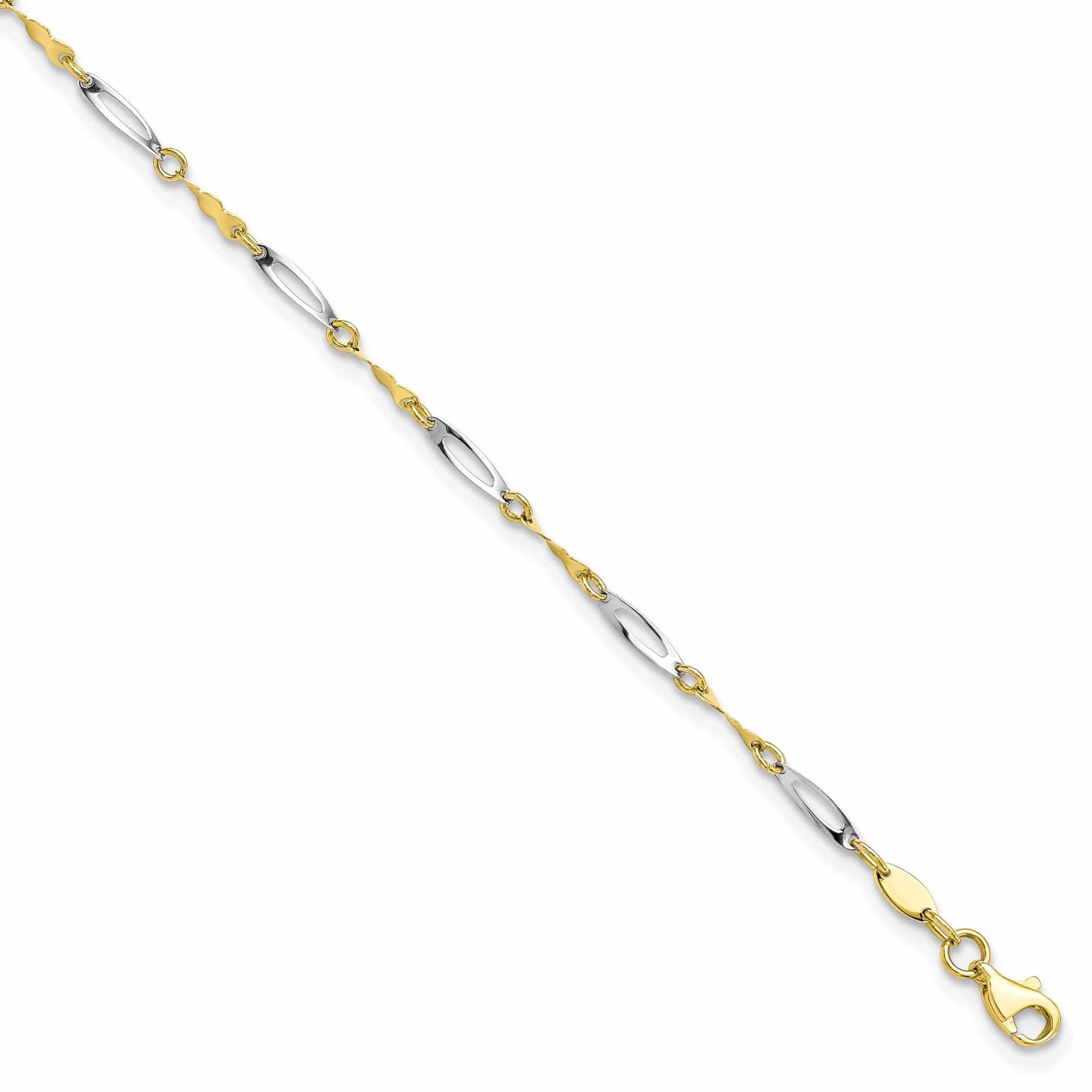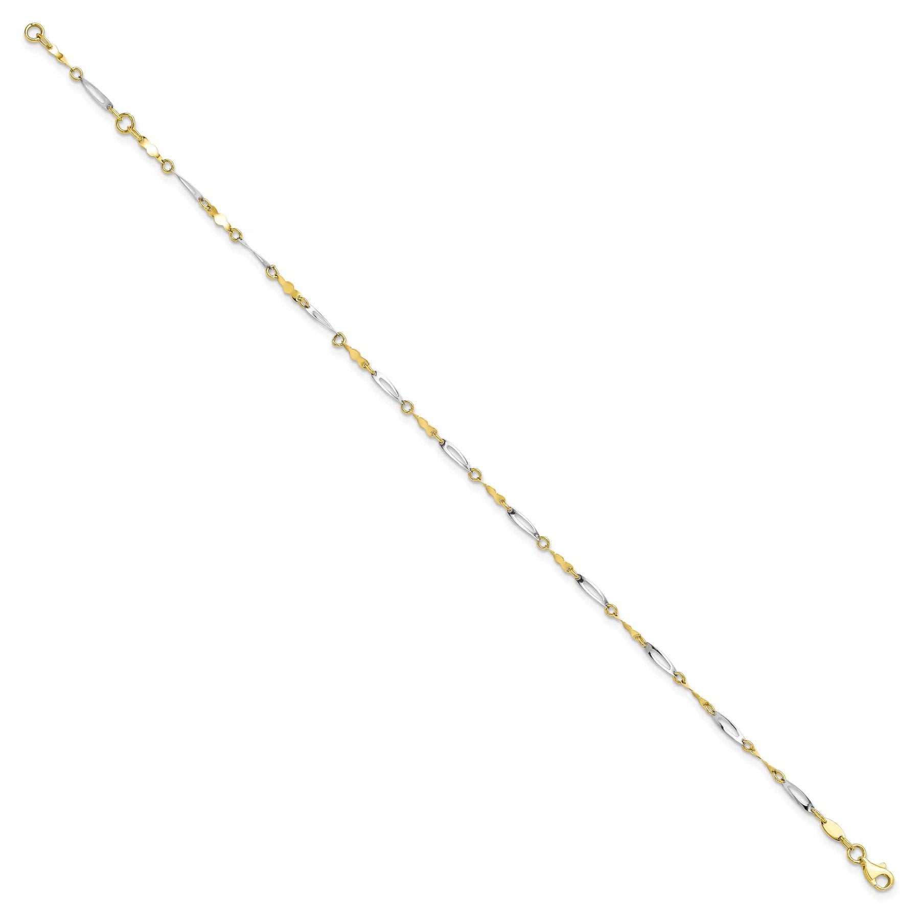 Elevate your summer style with Leslie's 10k Two Tone Gold Polished Finish Fancy Link Anklet with 1-inch extender. This stunning anklet features a unique combination of yellow and white gold, creating a chic and versatile accessory that will complement any outfit. The polished finish adds a touch of elegance, while the intricate fancy link design adds a fashionable flair. Whether you're soaking up the sun on the beach or strolling through the city streets, this anklet will add a touch of glamour to your look. With the 1-inch extender, you can easily adjust the length to fit your ankle perfectly. Treat yourself or surprise a loved one with this beautiful anklet that is sure to make a statement. Upgrade your jewelry collection with Leslie's 10k Two Tone Gold Polished Finish Fancy Link Anklet and shine bright all summer long.