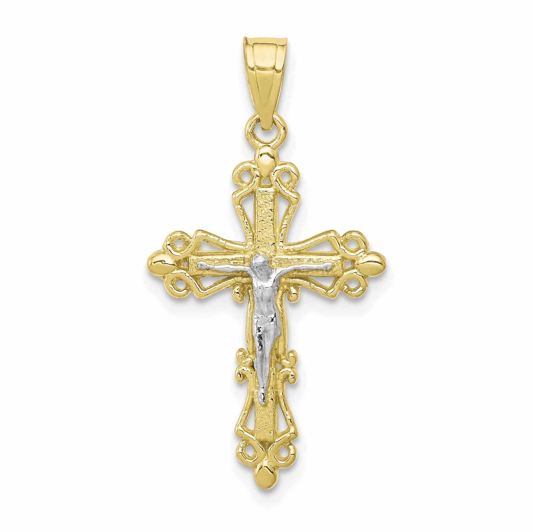 This exquisite 10k Yellow Rhodium Gold Crucifix Pendant is a stunning piece of religious jewelry that is sure to inspire and uplift. Crafted from high-quality 10k yellow gold with rhodium plating, this pendant is both durable and beautiful. With an average weight of 0.84 grams, it is lightweight and comfortable to wear all day long. The pendant measures 16mm in width, making it the perfect size to wear on its own or layered with other necklaces. The intricate crucifix design is a timeless symbol of faith and devotion, making this pendant a meaningful and stylish accessory. Whether you wear it for religious significance or simply for its elegant design, this 10k Yellow Rhodium Gold Crucifix Pendant is sure to become a treasured piece in your jewelry collection.
