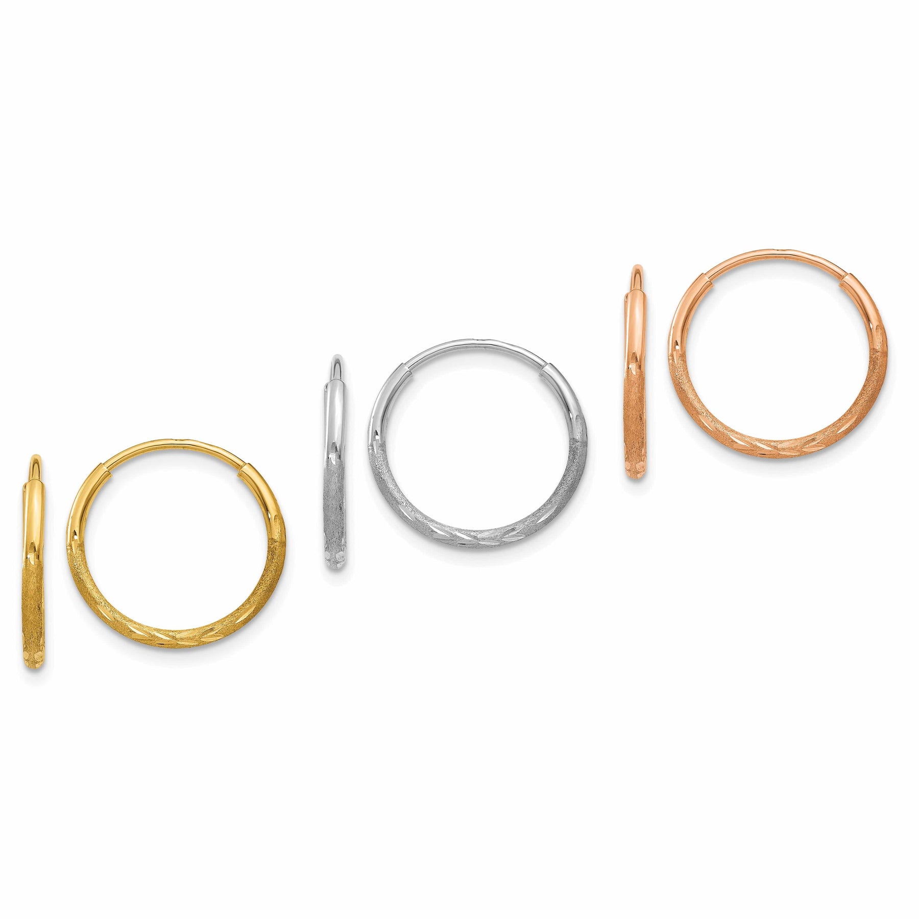 14K Tri-Color Gold Bold Diamond-Cut Satin 12mm Endless Hoop 3-Pair Set