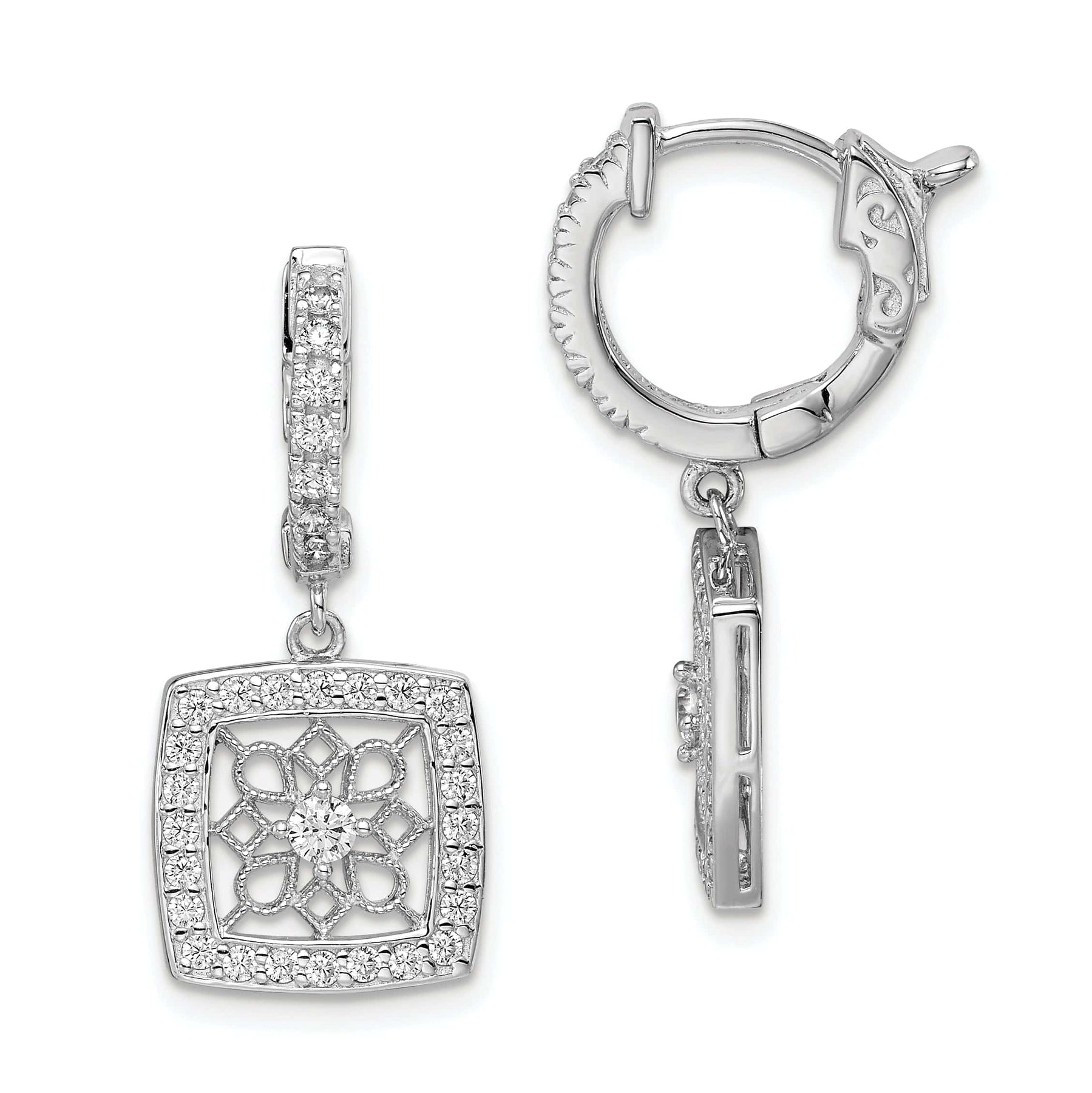 The intricate design features a dangle square snowflake embellished with sparkling cubic zirconia stones, adding a touch of glamour and sophistication to your look. The hinged hoop closure ensures a secure and comfortable fit, while the average weight of 4.54 grams makes them lightweight enough for all-day wear.