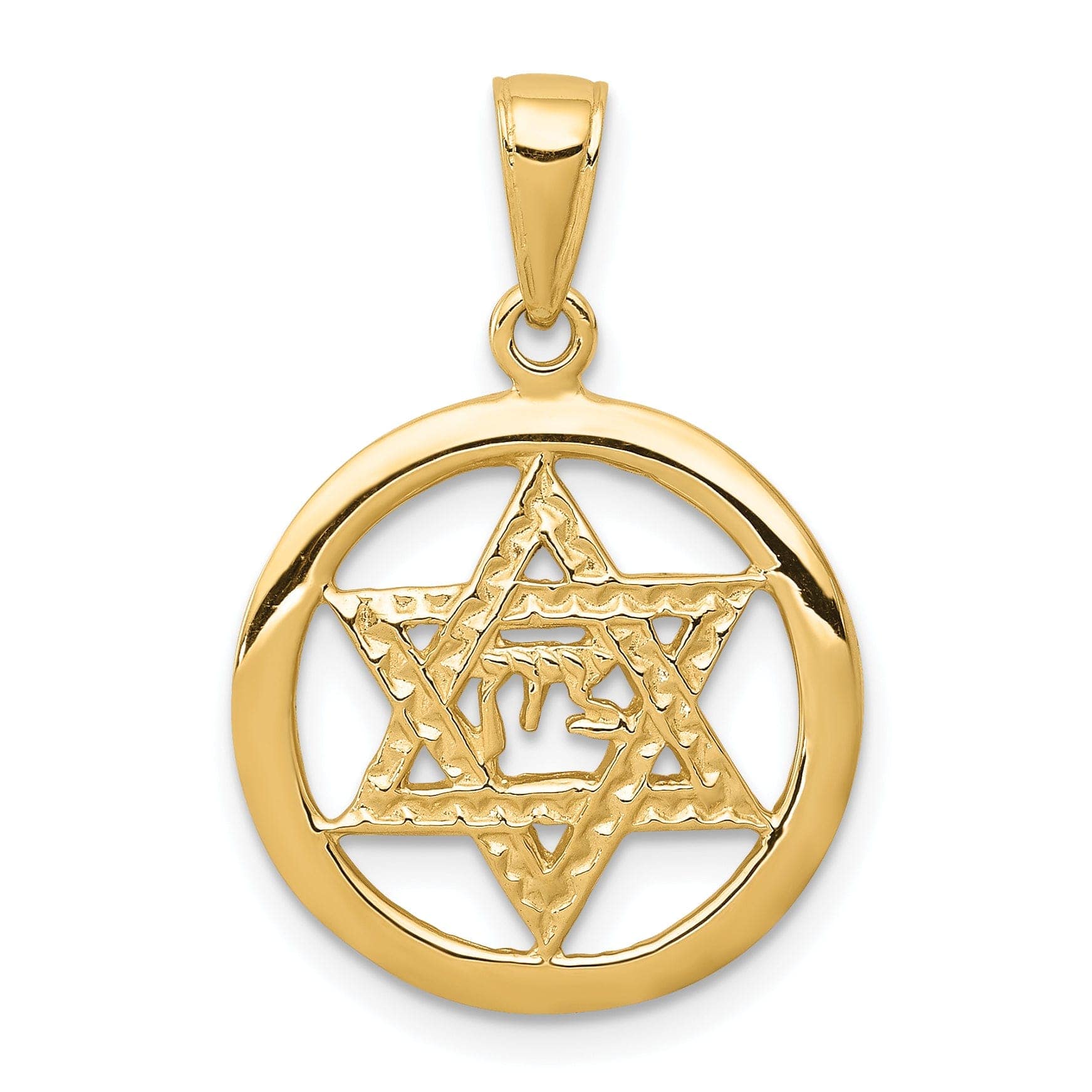 Adicione um toque de elegância e significado ao seu guarda-roupa com este requintado Pendente Judaico Chai na Estrela de David em Ouro Amarelo 14K com Acabamento Polido.