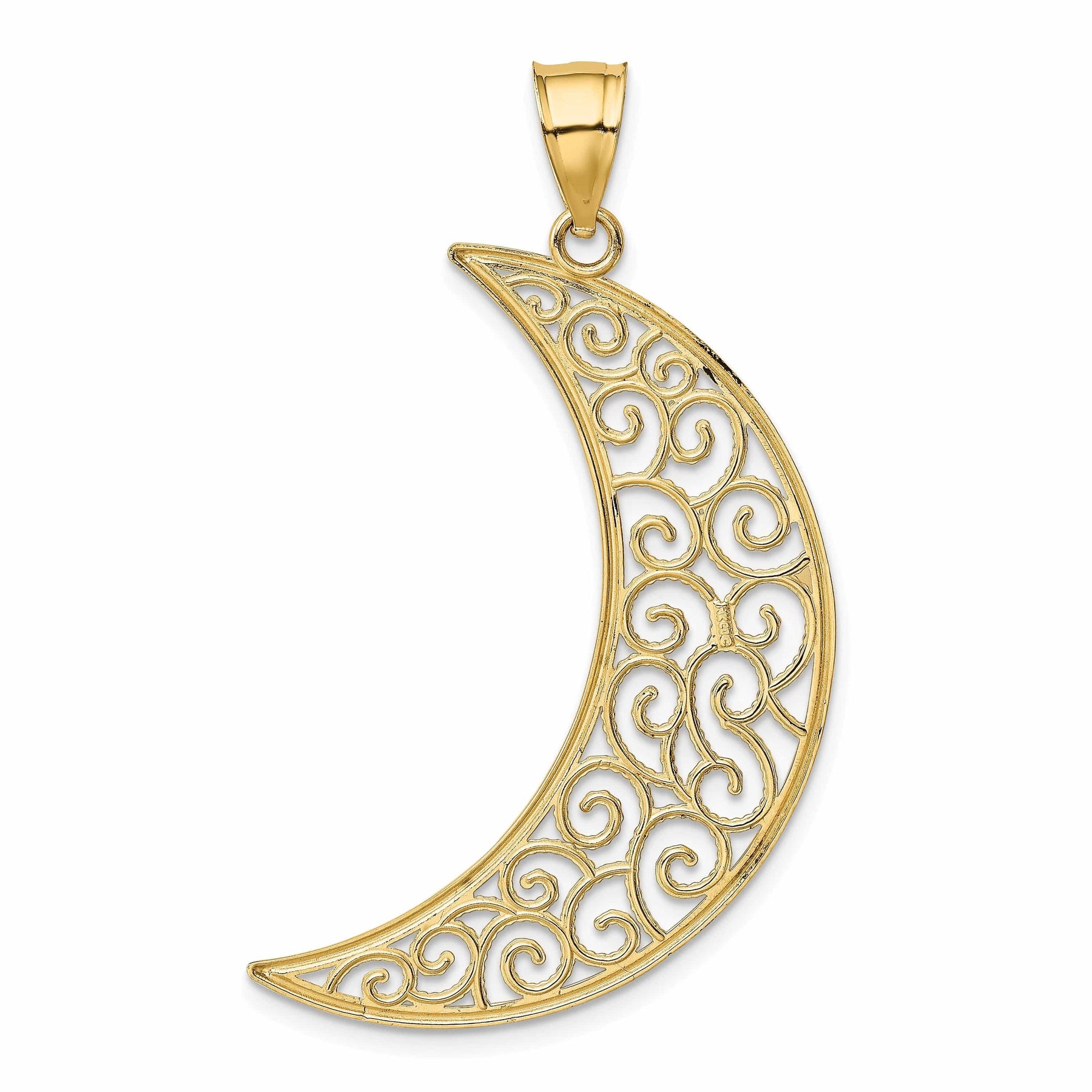 Adicione um toque de beleza celestial à sua coleção de joias com este deslumbrante pendente de filigrana com design de lua, em ouro amarelo maciço 14k, com verso aberto e acabamento polido sólido. Encomende já o seu e eleve o seu estilo a novos patamares.