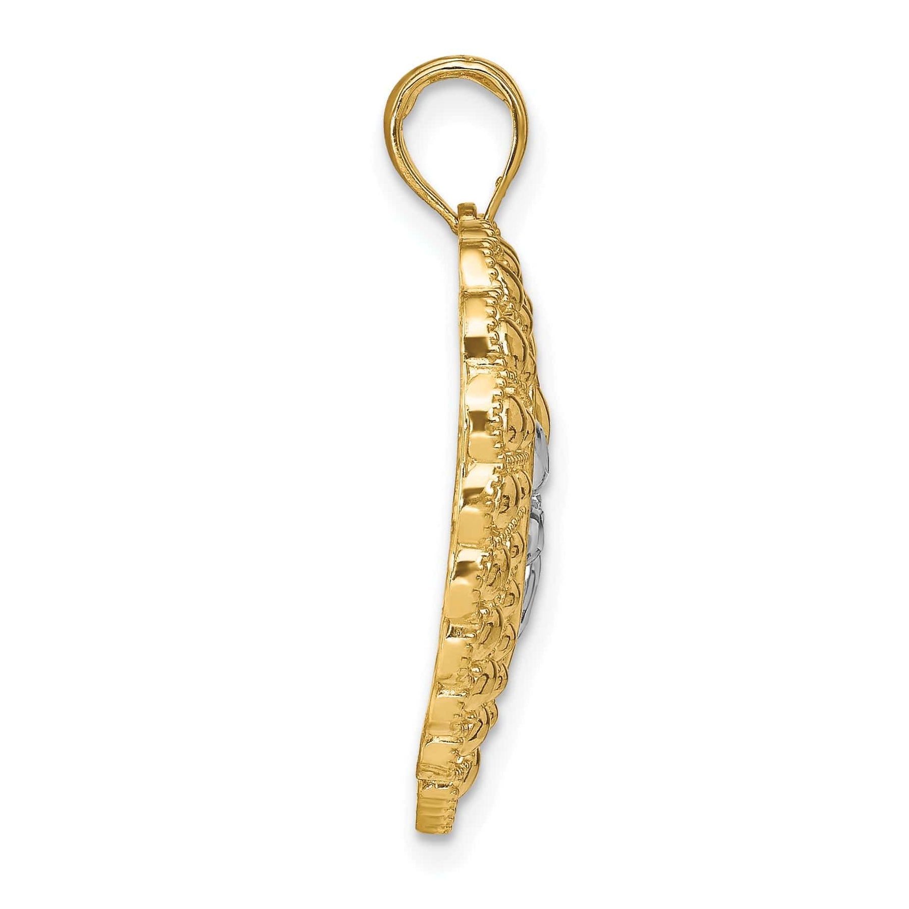 Pesando 2,14 gramas e medindo 29,6 mm de comprimento por 23,25 mm de largura, este pendente tem o tamanho perfeito para se destacar sem ser demasiado imponente. A textura intricada com contornos em contas acrescenta um toque único à peça, tornando-a distinta das demais.