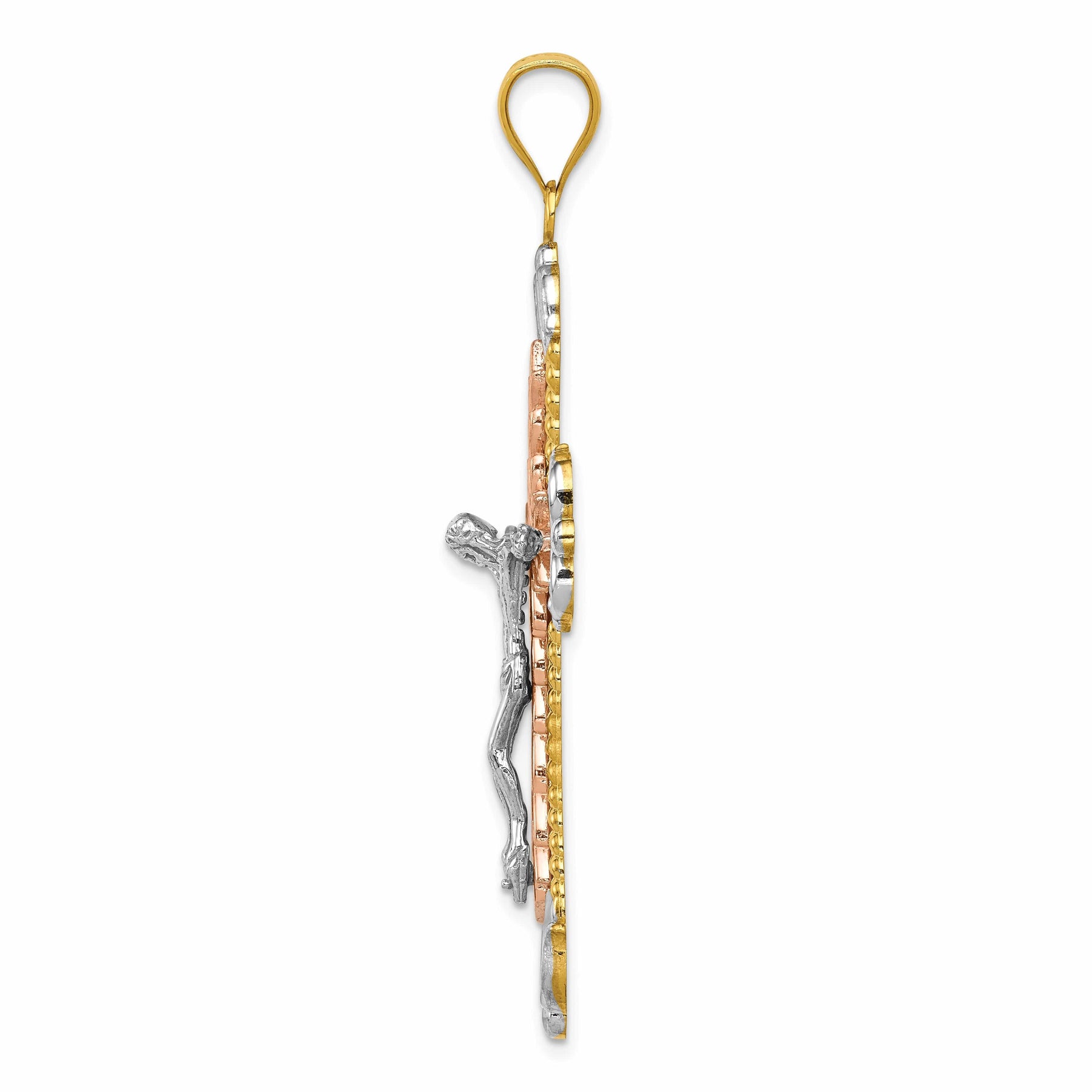 Eleve a sua coleção de joalharia com o requintado Pendente Cruz D.C Fleur de Lis Clássico Grande em Ouro Tri-Color 14K. Esta peça deslumbrante apresenta um design facetado que exibe uma bela combinação de ouro tri-color, garantindo que se destaque com elegância. Fabricado em ouro maciço 14K durável, este pendente pesa 5,2 gramas e mede 55 mm de comprimento por 34 mm de largura, tornando-o o acessório perfeito para qualquer ocasião. Experimente o luxo e a beleza intemporal com este extraordinário pendente em forma de cruz.