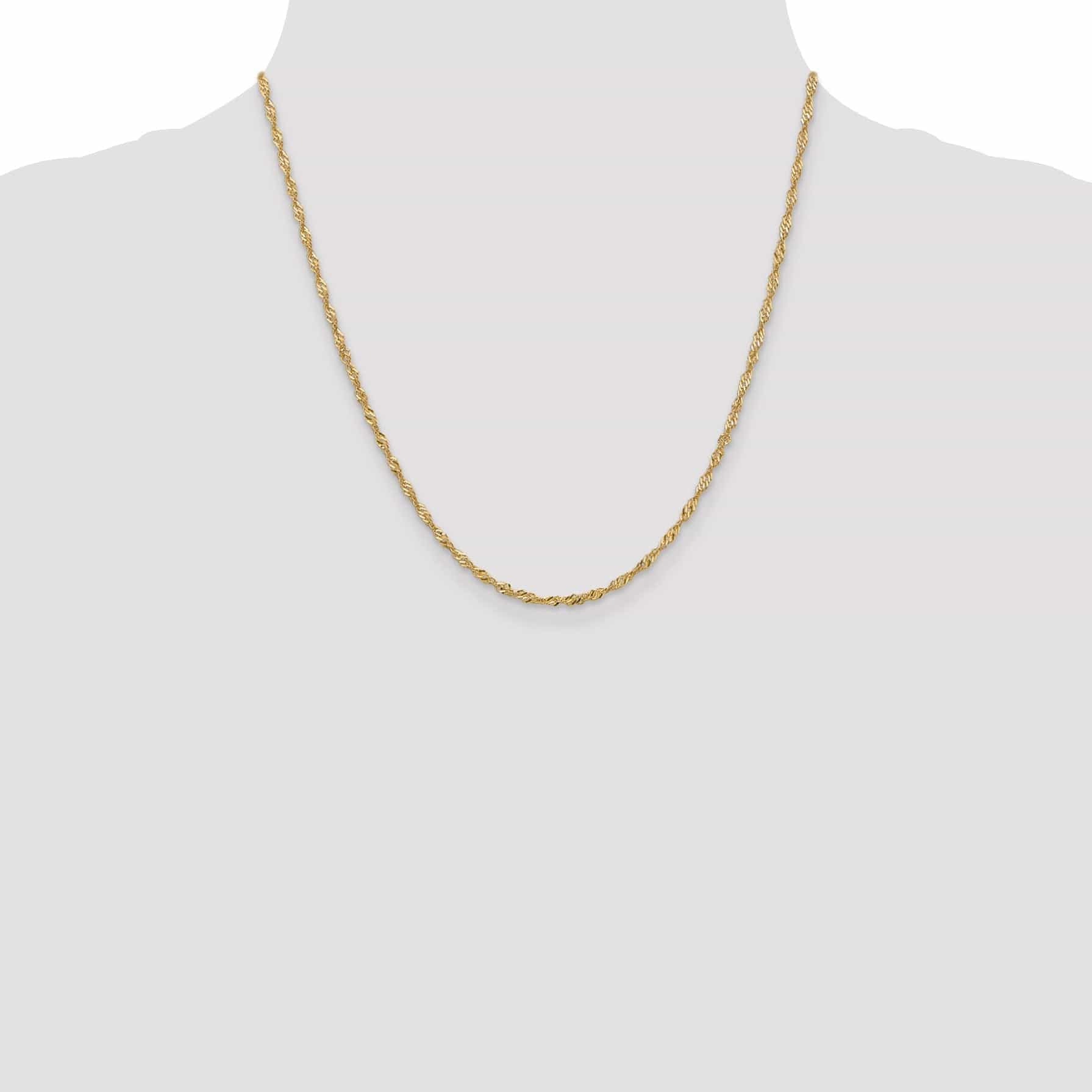 O design da corrente Singapura apresenta uma série de elos torcidos que criam um aspeto único e cativante. Com 1,9 mm de largura, esta corrente é delicada o suficiente para ser usada sozinha, mas também suficientemente forte para suportar o seu pendente ou penduricalho favorito.