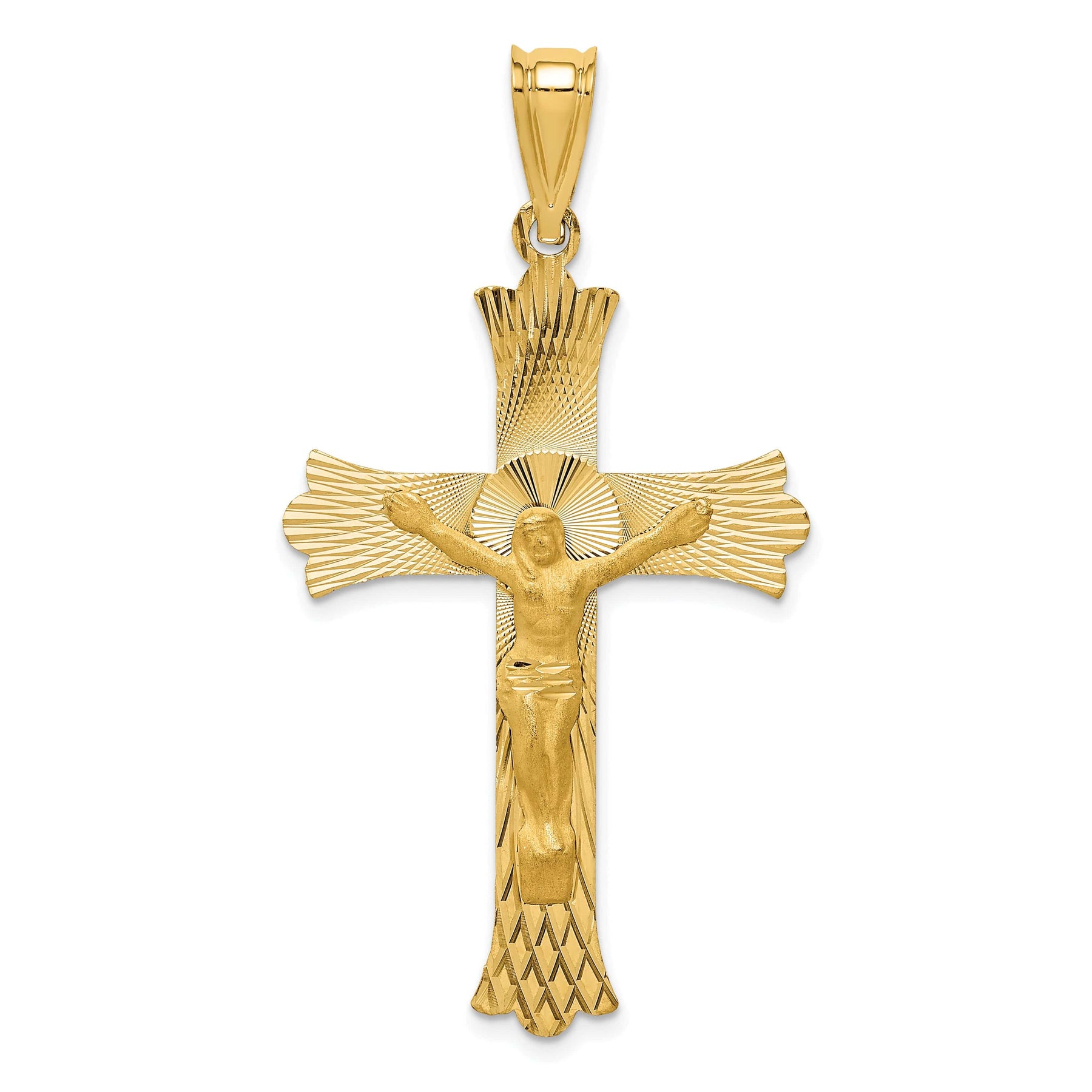 Được chế tác từ vàng 14K màu vàng, Mặt Dây Chuyền Thánh Giá Cắt Kim Cương và Satin Cổ Điển này toát lên vẻ thanh lịch vượt thời gian. Với lớp hoàn thiện satin bóng mượt và chi tiết cắt kim cương tinh xảo, sản phẩm đặc chắc nặng 2,59 gram, kích thước dài 49,5 mm và rộng 27 mm. Với kết cấu bền bỉ và thiết kế tuyệt đẹp, mặt dây chuyền này là biểu tượng hoàn hảo của đức tin và phong cách.