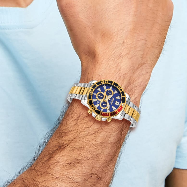 Đồng hồ bấm giờ Mason Sales dành cho nam với thiết kế hai tông màu là chiếc đồng hồ đeo tay nam phong cách được chế tác từ thép không gỉ đánh bóng. Với mặt số màu xanh dương và bộ máy quartz Nhật Bản đáng tin cậy, chiếc đồng hồ này cân bằng hoàn hảo giữa sự tiện dụng hàng ngày và thiết kế tinh tế. Vỏ đồng hồ được mạ vàng sang trọng. Vành đồng hồ xoay một chiều tạo điểm nhấn nổi bật.
